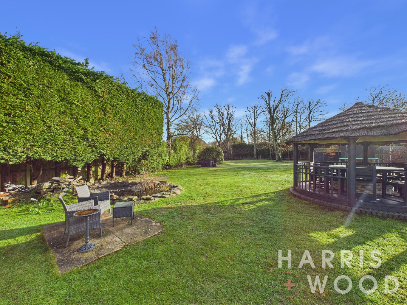 Predominantly laid to lawn and enclosed by wooden panel fencing, with mature shrubs and trees to the rear, features include a pond, pergola seating area, and a well located beneath the pergola