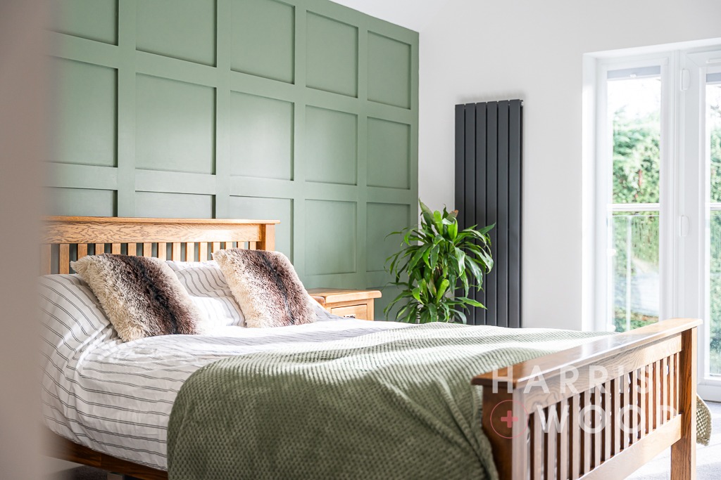 An impressive principal bedroom with vaulted ceiling, large dressing area, and built-in sliding wardrobes, UPVC doors and windows to the rear open to a Juliet balcony, two radiators, door to: