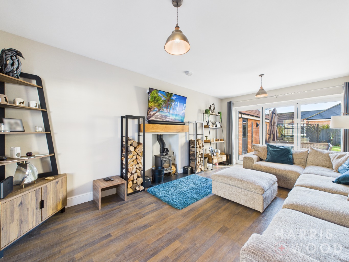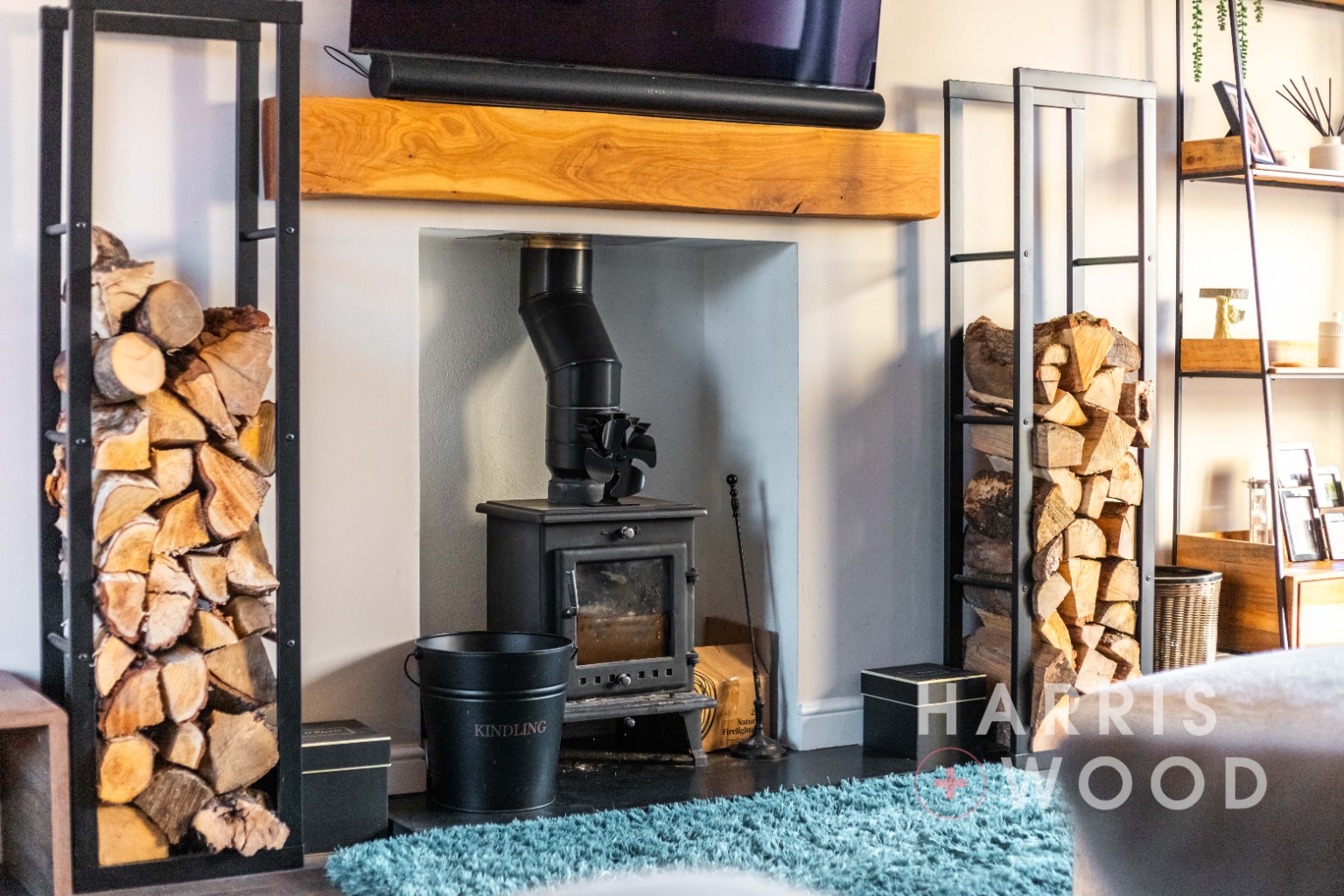 Double glazed window to front, bi-folding doors to rear, wood burner