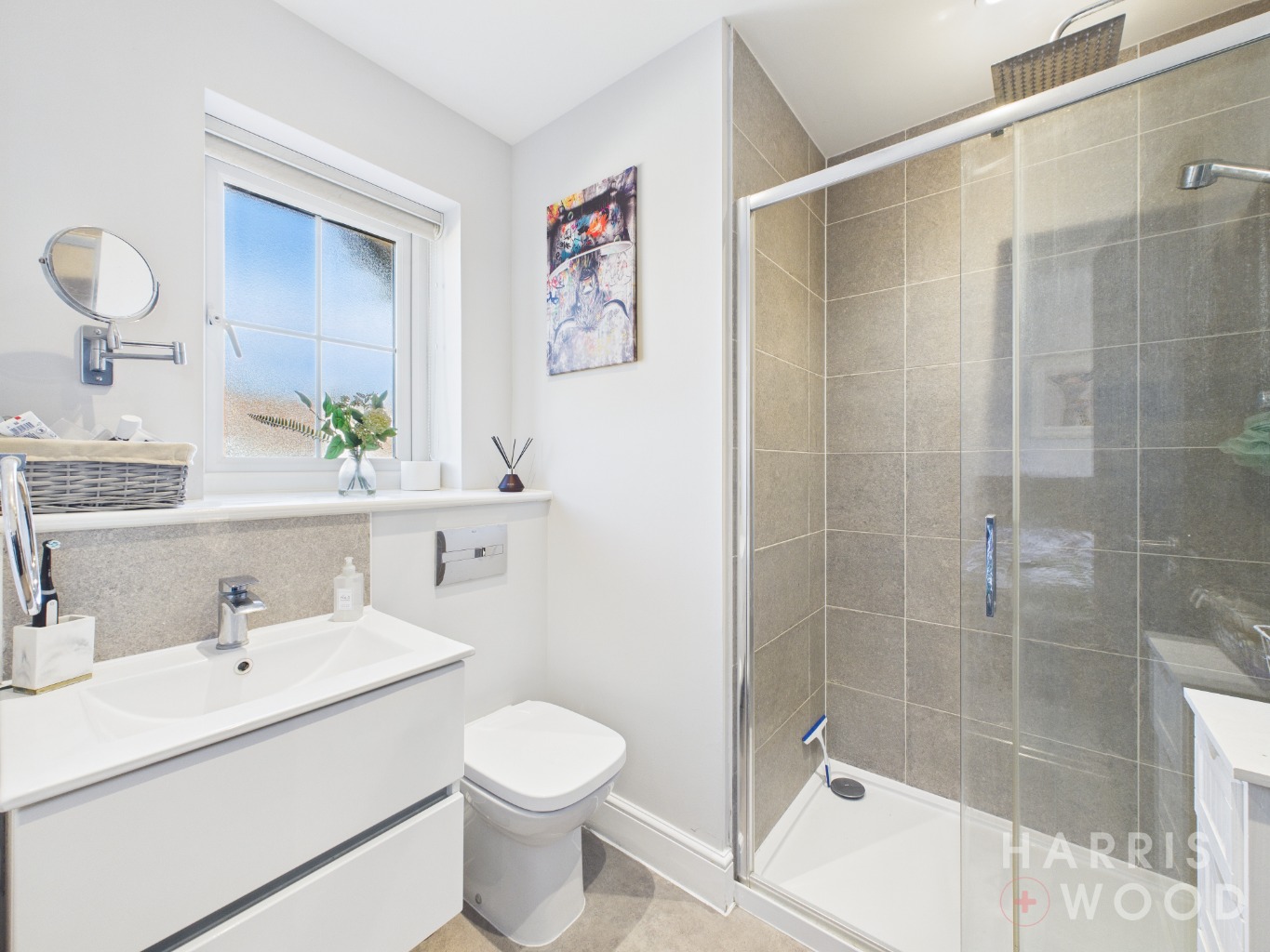 Double glazed window to side, low level WC, wash hand basin, fully tiled shower cubicle, chrome heated towel rail