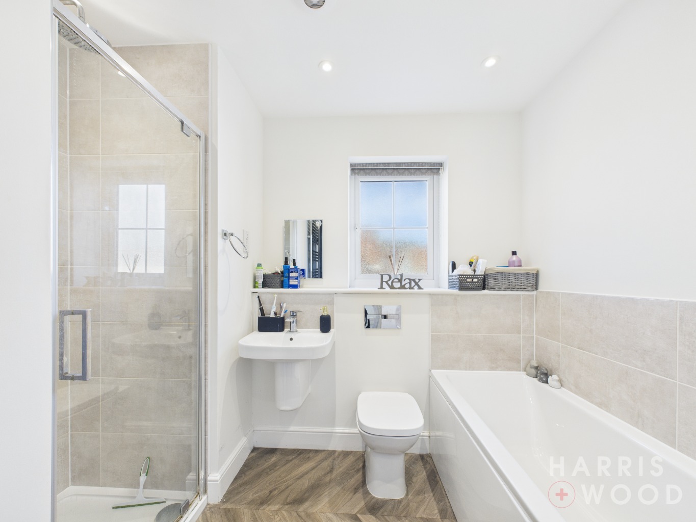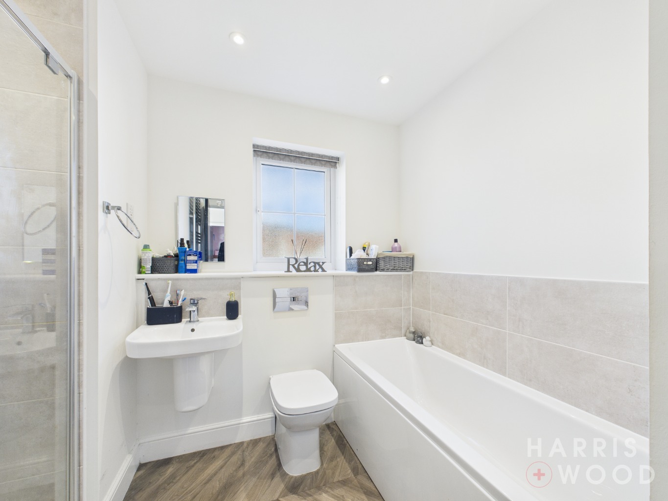 Double glazed window to rear, low level WC, wash hand basin, bath with shower over, chrome heated towel rail