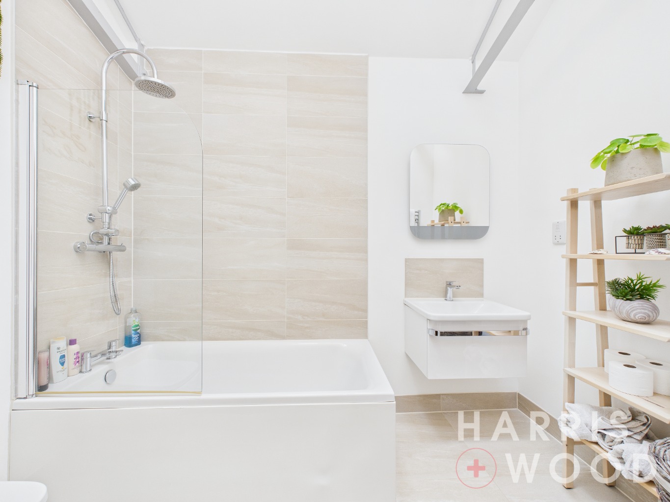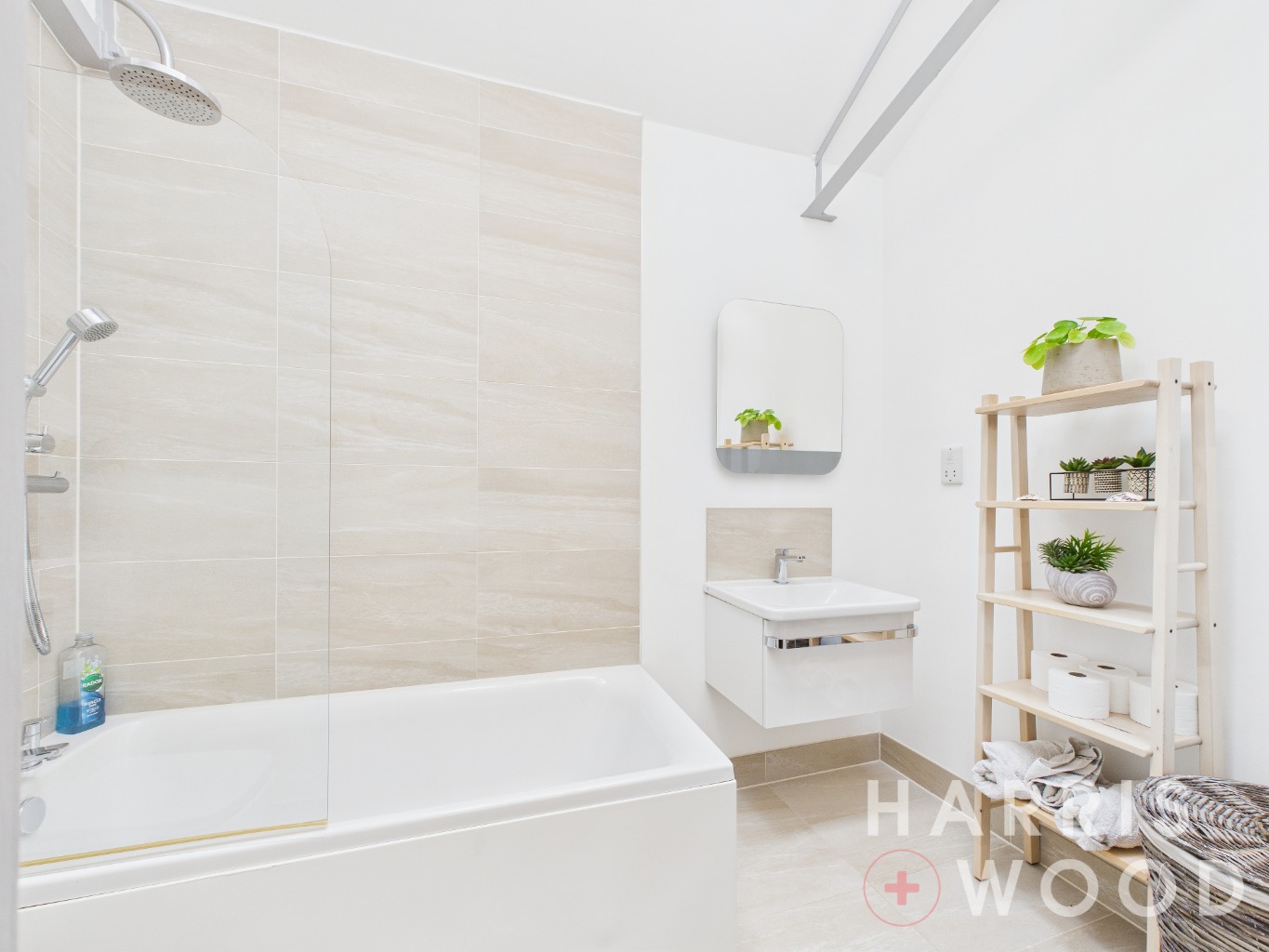 Two velux windows, low level WC, wash hand basin, bath with shower over, heated towel rail, extractor fan, tiled flooring, partly tiled walls