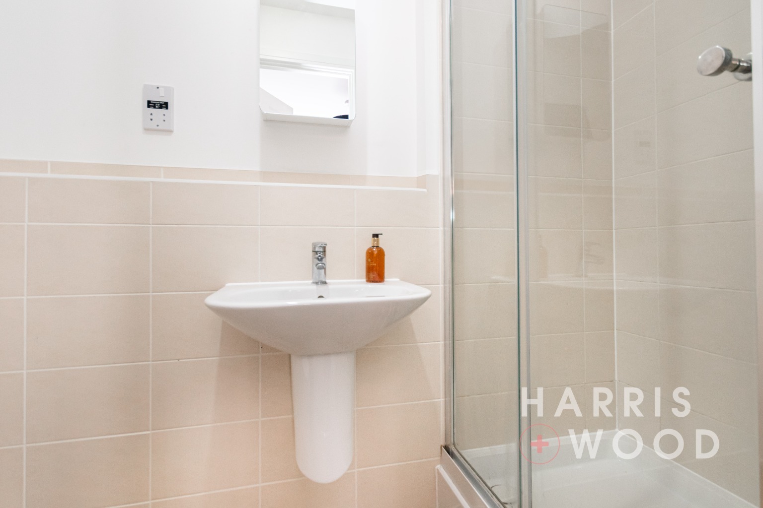 Low level WC, wash hand basin, fully tiled shower cubicle, chrome heated towel rail