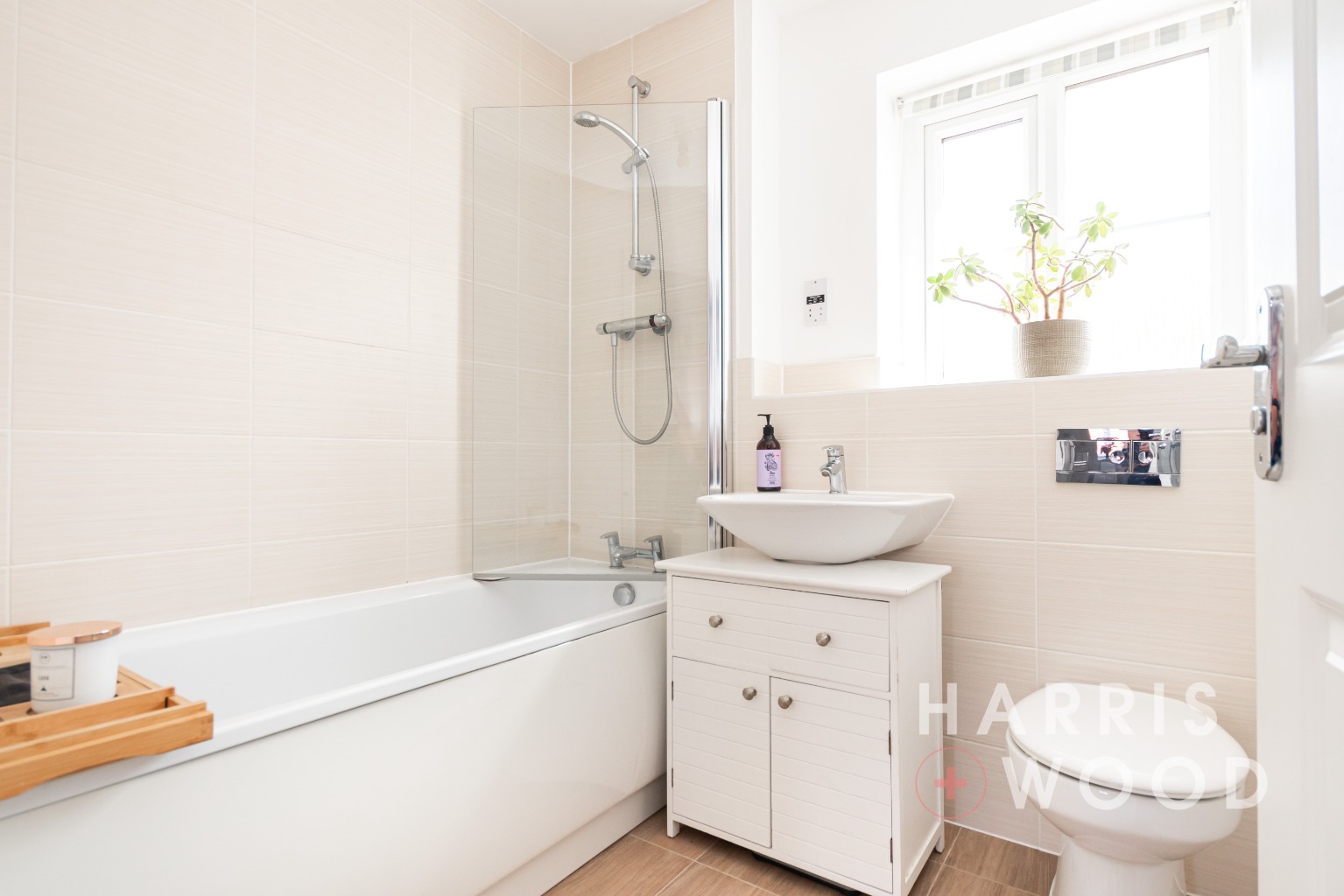 Double glazed window to front, low level WC, wash hand basin, bath with shower over, chrome heated towel rail