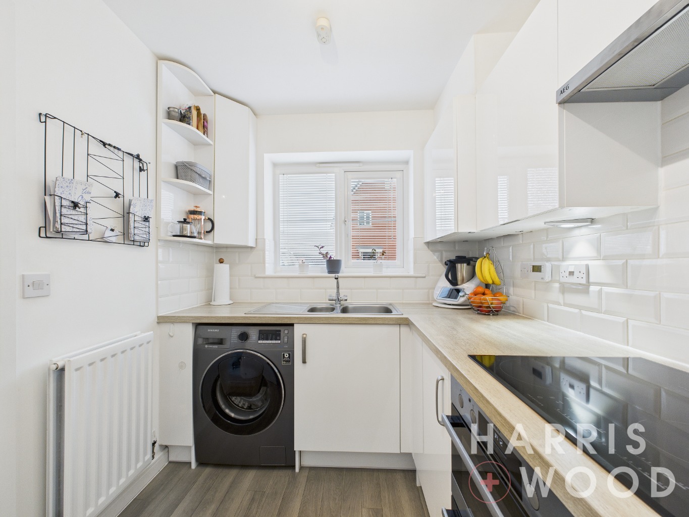 Double glazed window to front, wall and base level units, sink and drainer with mixer tap over, oven and hob, extractor fan, worktops, integrated washing machine
