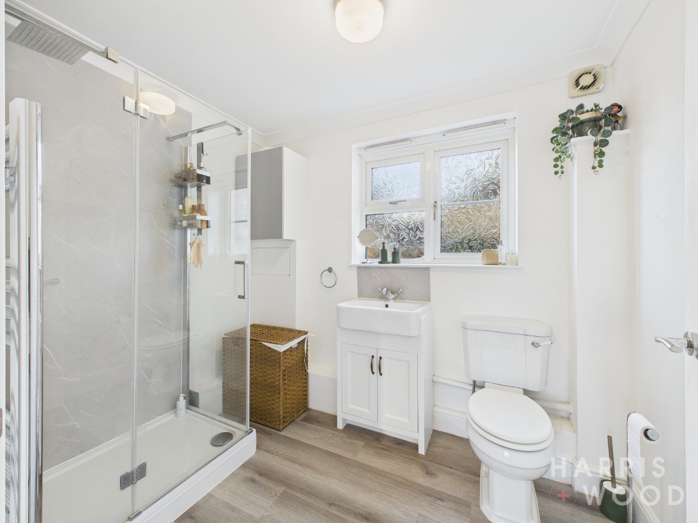 Double glazed window, low level WC, wash hand basin, shower cubicle, partly tiled walls, extractor fan, cupboard housing the boiler plus storage cupboard