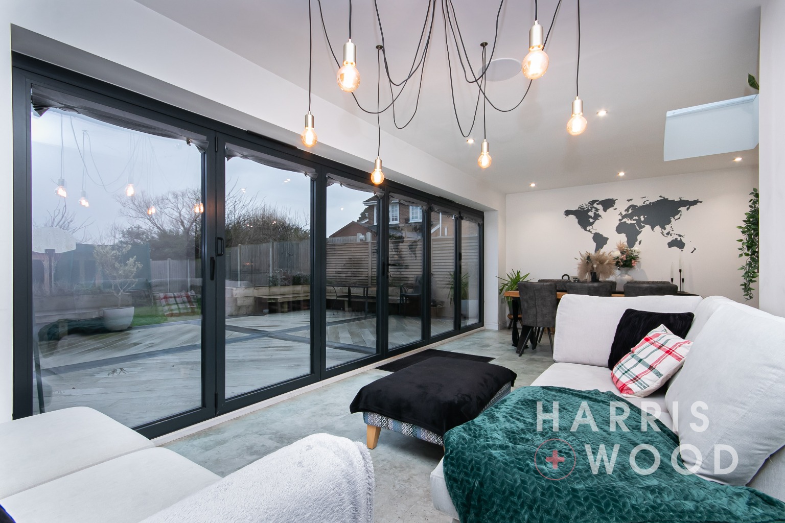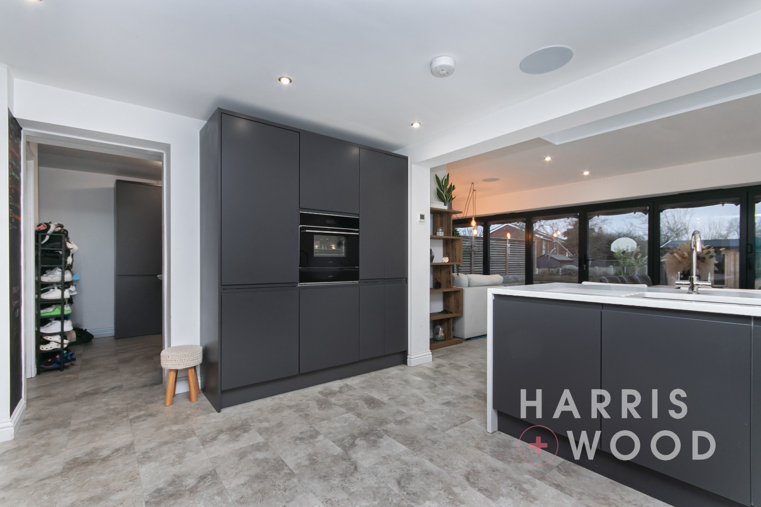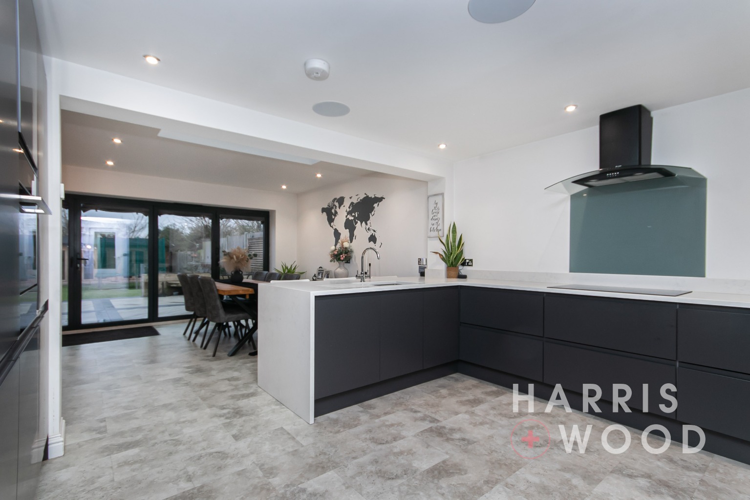 Roof lantern, large bi-folding doors, wall and base level units, sink and drainer with mixer tap over, oven and hob, extractor fan, worktops, integrated appliances