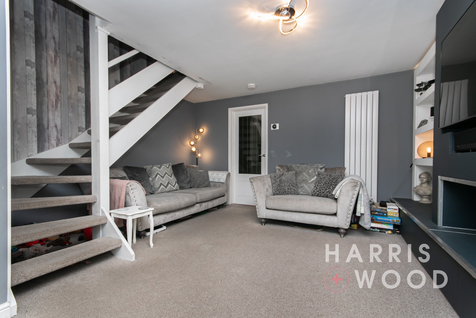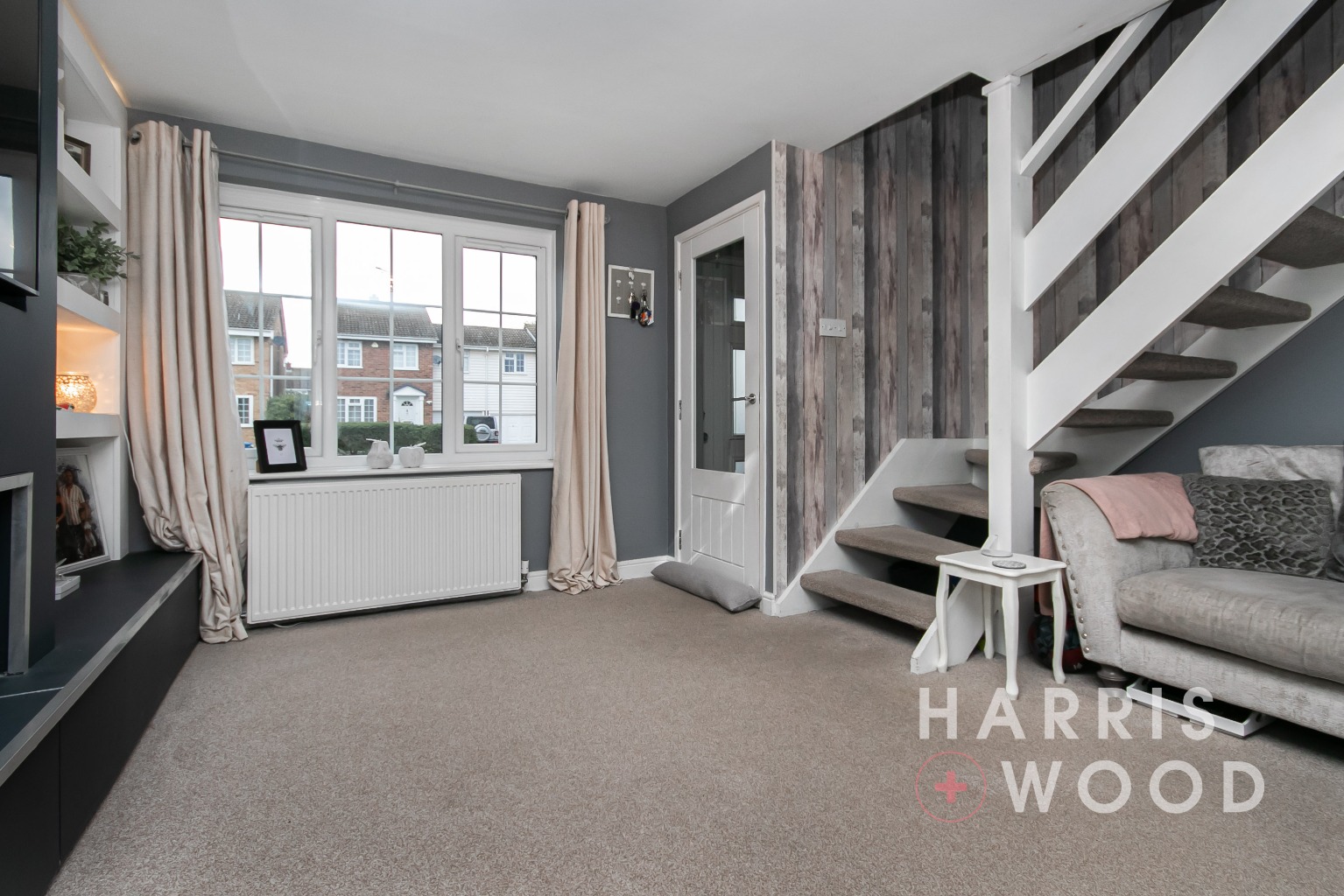 Double glazed window, stairs rising to the first floor landing, media wall, radiator