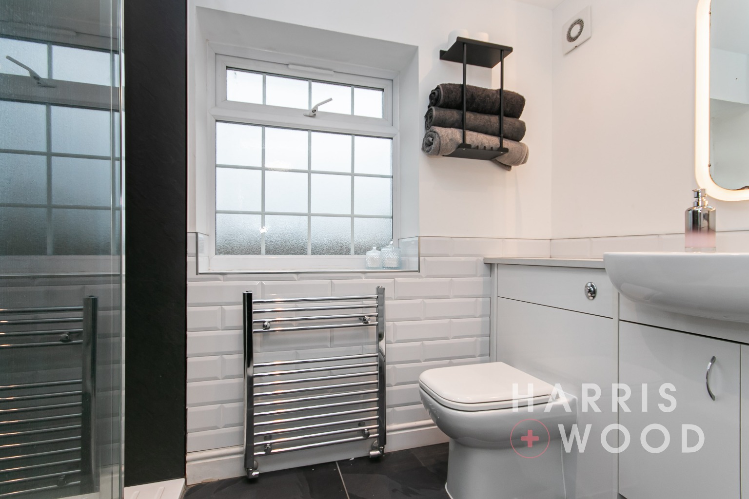 Obscure double glazed window, low level WC, wash hand basin, shower cubicle, partly tiled walls, heated towel rail, tiled flooring