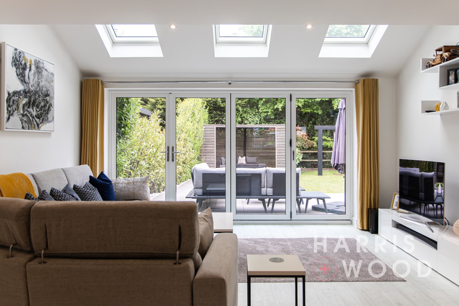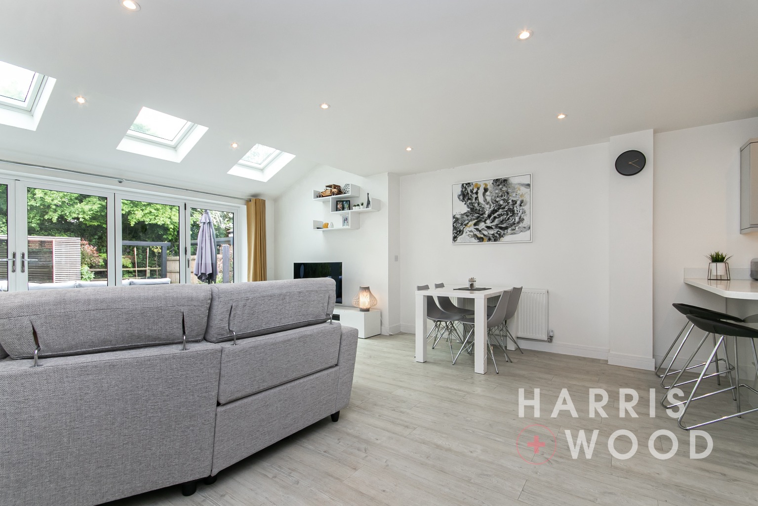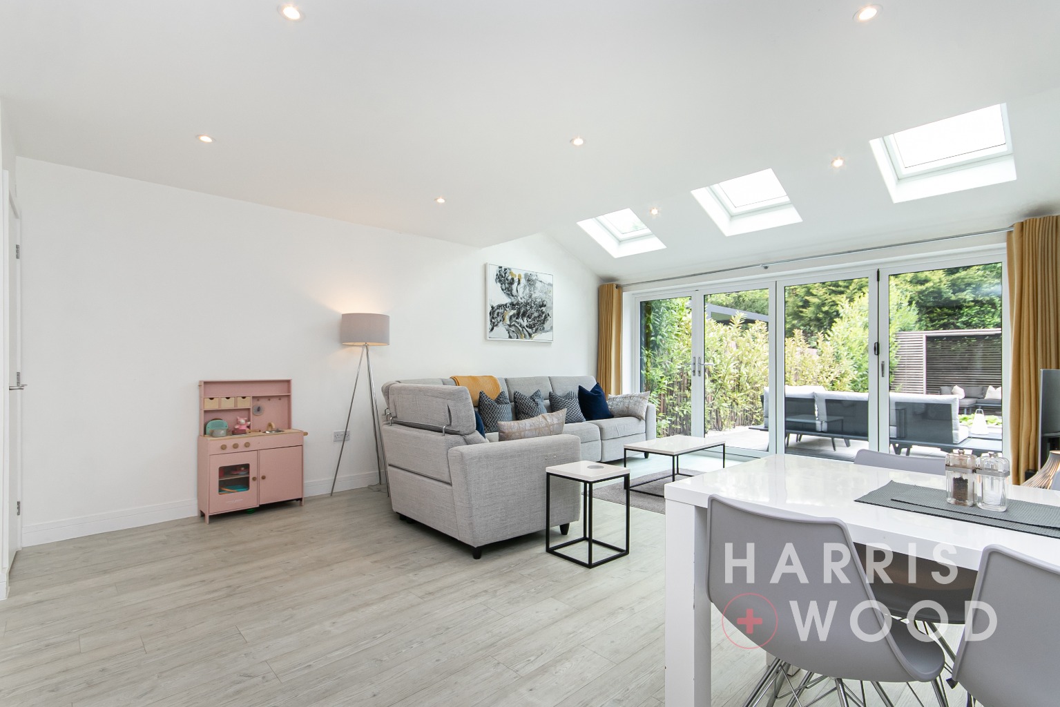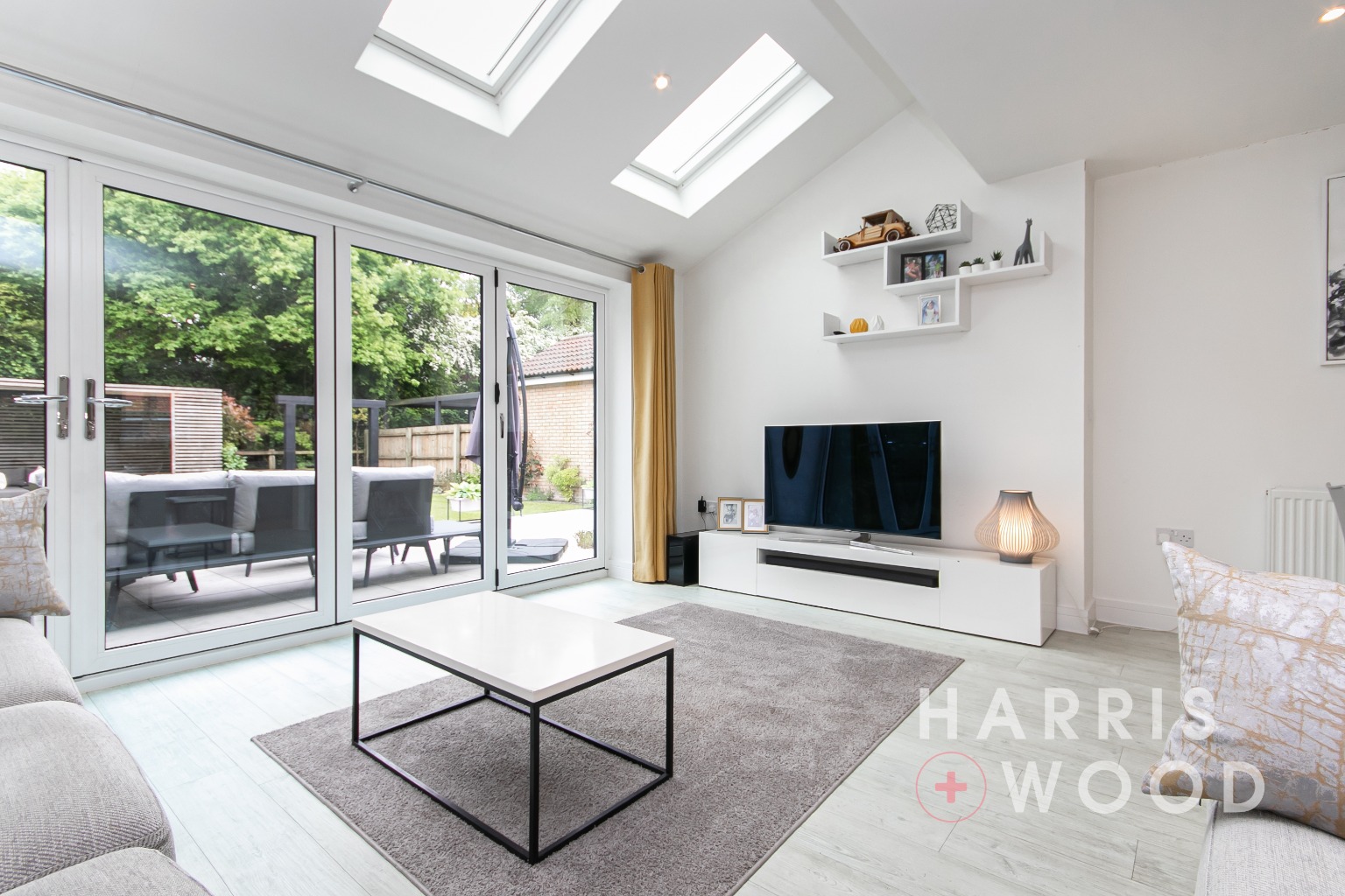 Three skylight windows, b-folding doors leading out onto the rear garden, built in understairs storage cupboard, wood effect flooring