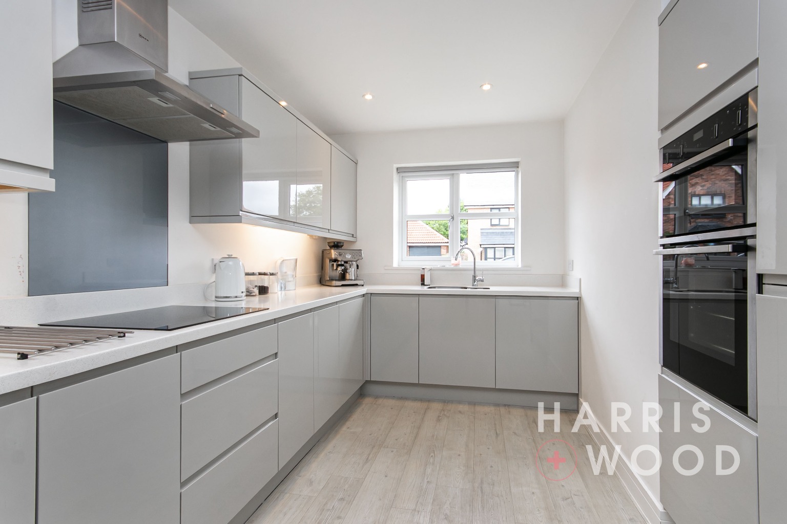 Double glazed window to front, modern wall and base level units, sink and drainer with mixer tap over, oven and induction hob, extractor fan, worktops, integrated appliances, tiled splashbacks, wood effect flooring, open plan to: