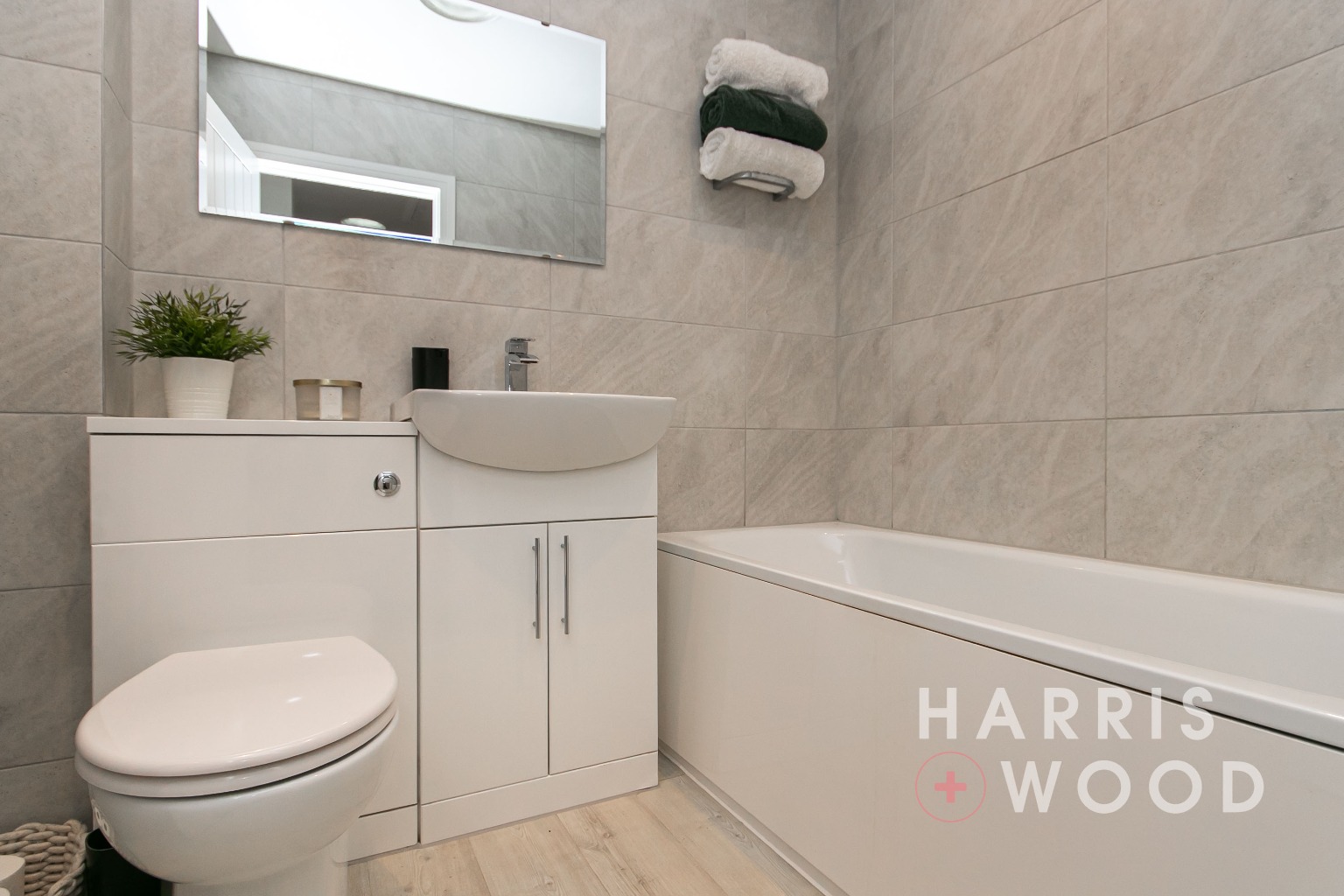 Tunnel skylight, low level WC, wash hand basin, bath with shower over, partly tiled, heated towel rail