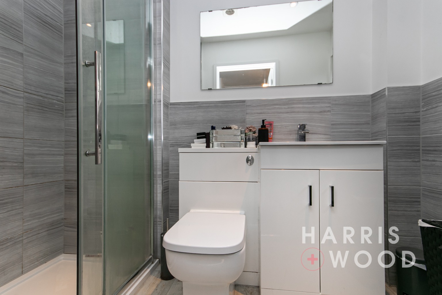Double glazed window to rear, low level WC, wash hand basin, bath with shower over, heated towel rail
