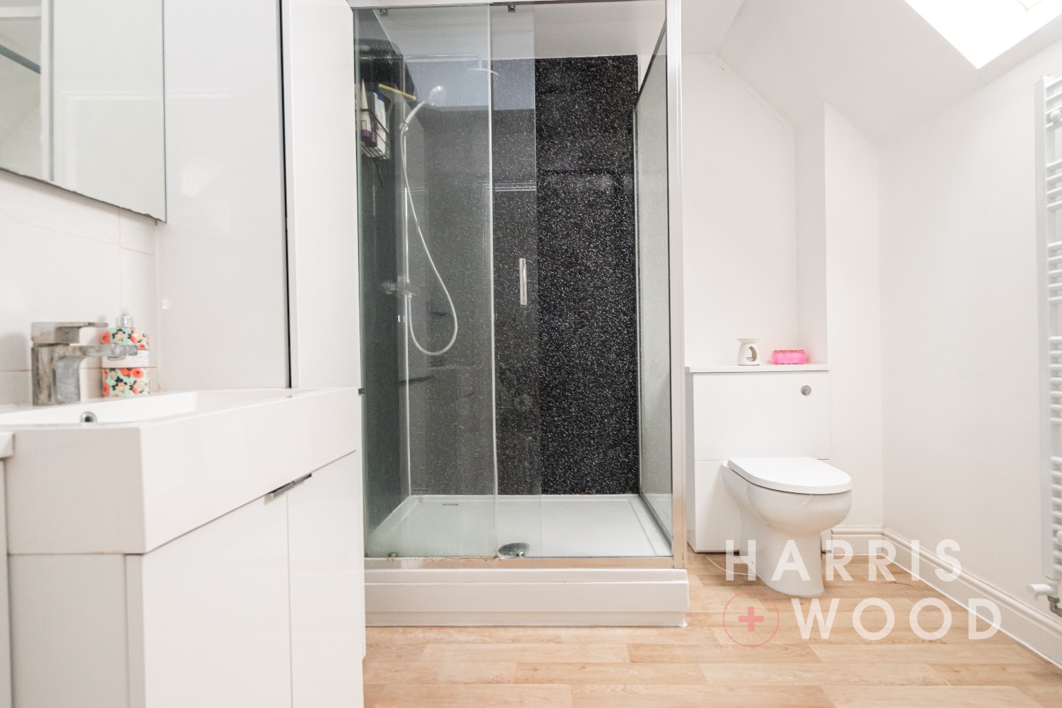 Shower cubicle, wash hand basin, low level WC, heated towel rail, loft access, part tiled walls, velux skylight window