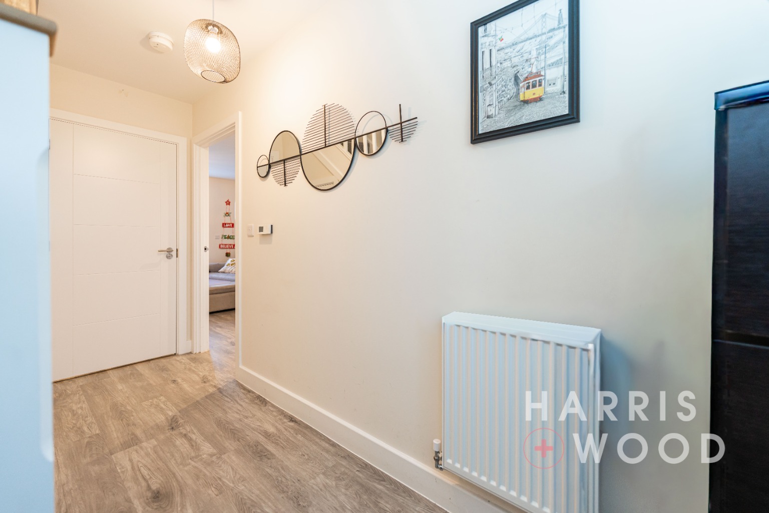 Entrance door, stairs rising to the first floor landing, radiator, doors leading off