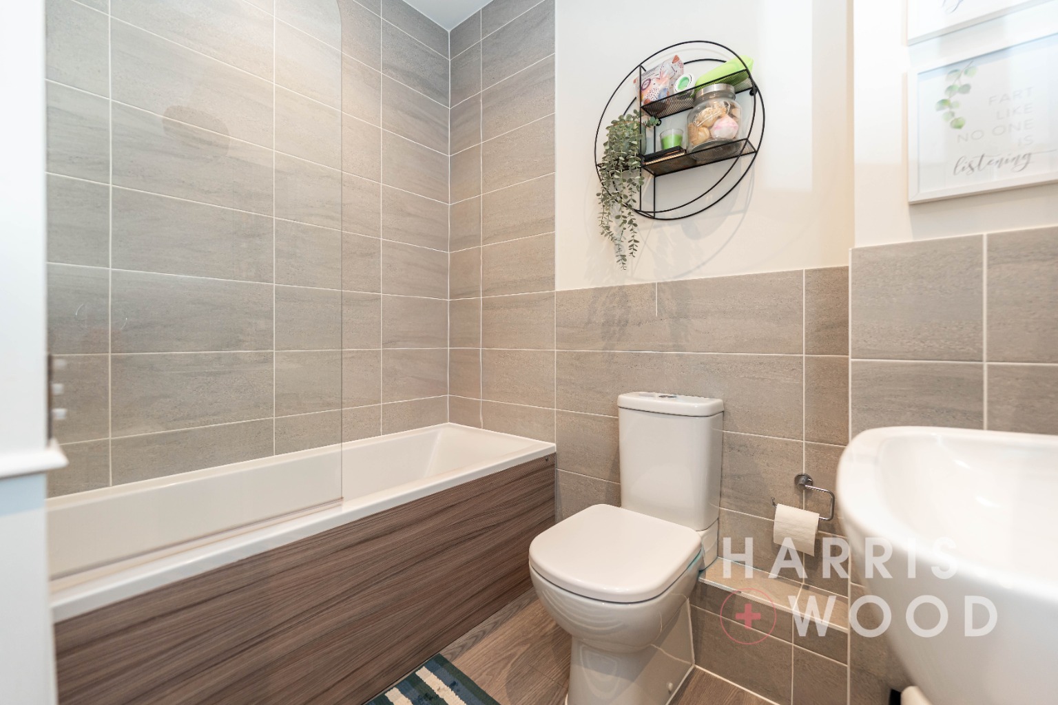 Low level WC, wash hand basin, bath with shower over, chrome heated towel rail