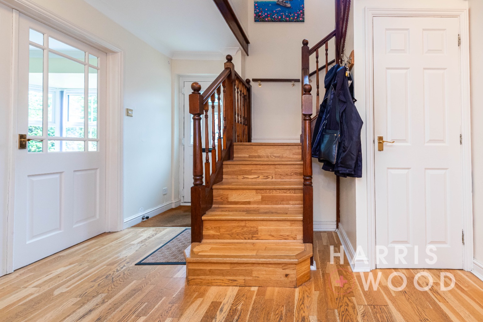 Entrance door, stairs rising to the first floor landing, understairs storage cupboard, doors leading off