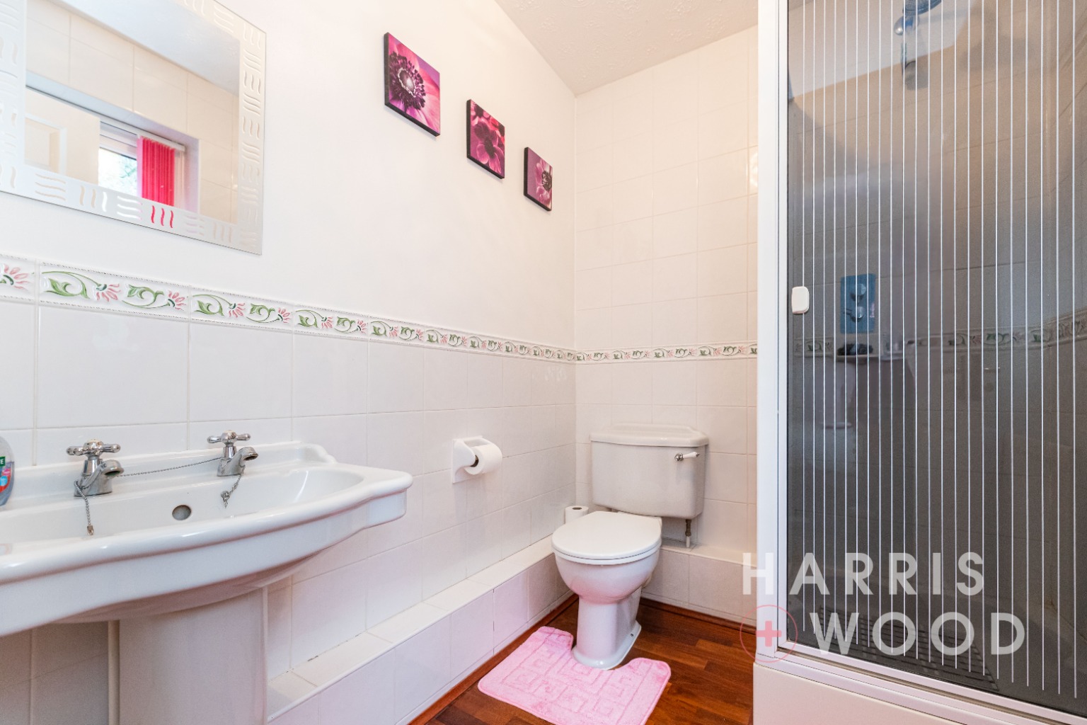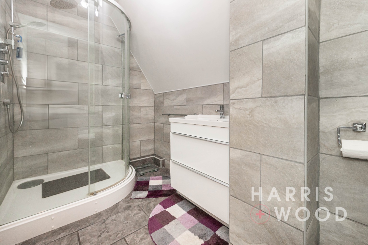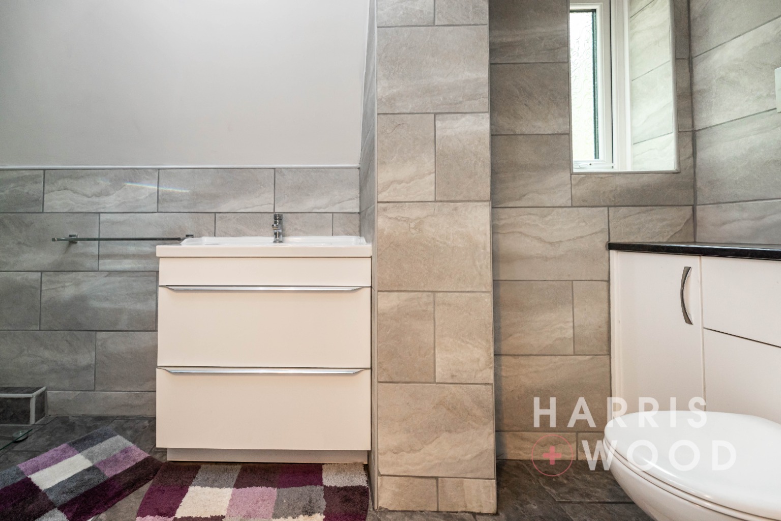 Double glazed window to side, low level WC, Vanity hand wash basin with cupboards under, fully tiled shower cubicle, heated towel rail