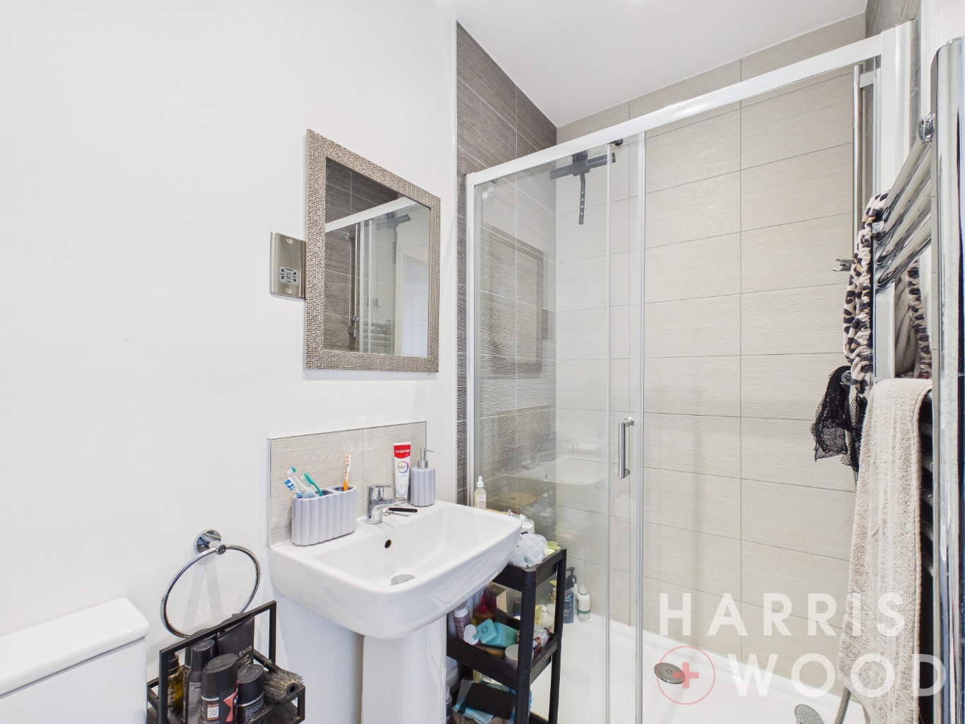 Low level WC, wash hand basin, shower cubicle, heated towel rail
