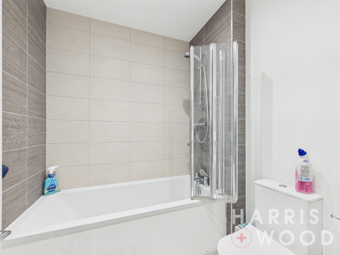 Low level WC, wash hand basin, bath with shower over, heated towel rail