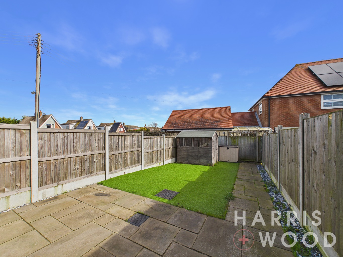 Fully enclosed and private, laid to AstroTurf, patio area, shed, gate to off road parking area