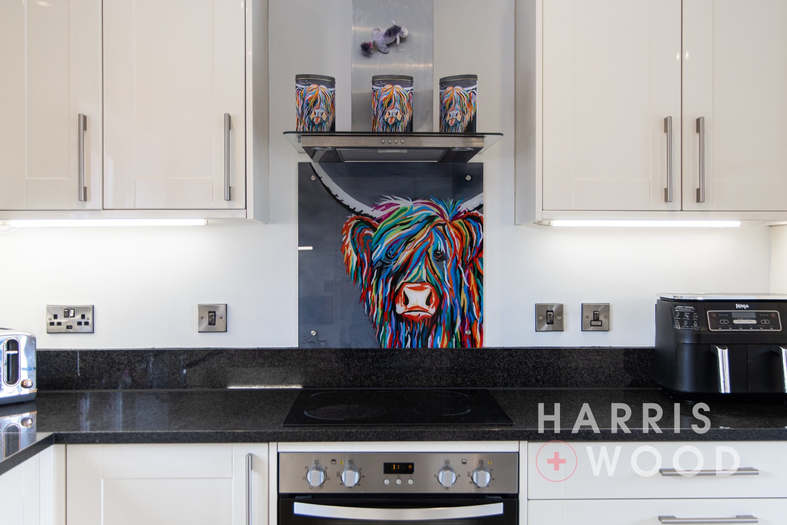 Double glazed window and French doors, wall and base level units, sink and drainer with mixer tap over, oven and hob, extractor fan, worktops, space for appliances, underfloor heating