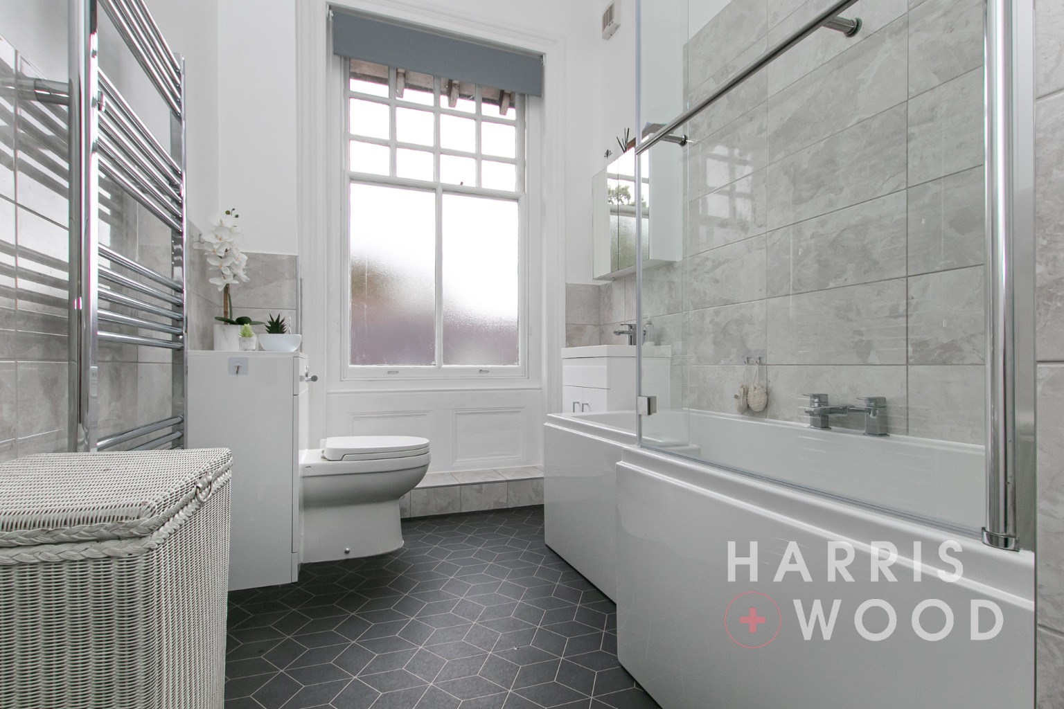 Original sash window to side, low level WC, p shaped bath with shower over, radiator, partly tiled walls, tiled flooring, extractor fan