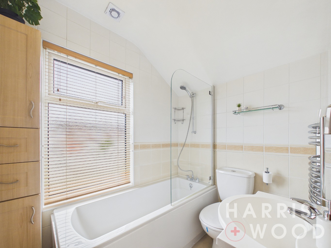 Double glazed window to rear, low level WC, wash hand basin with storage under, bath with shower over, heated towel rail, separate tallboy storage, shaver socket
