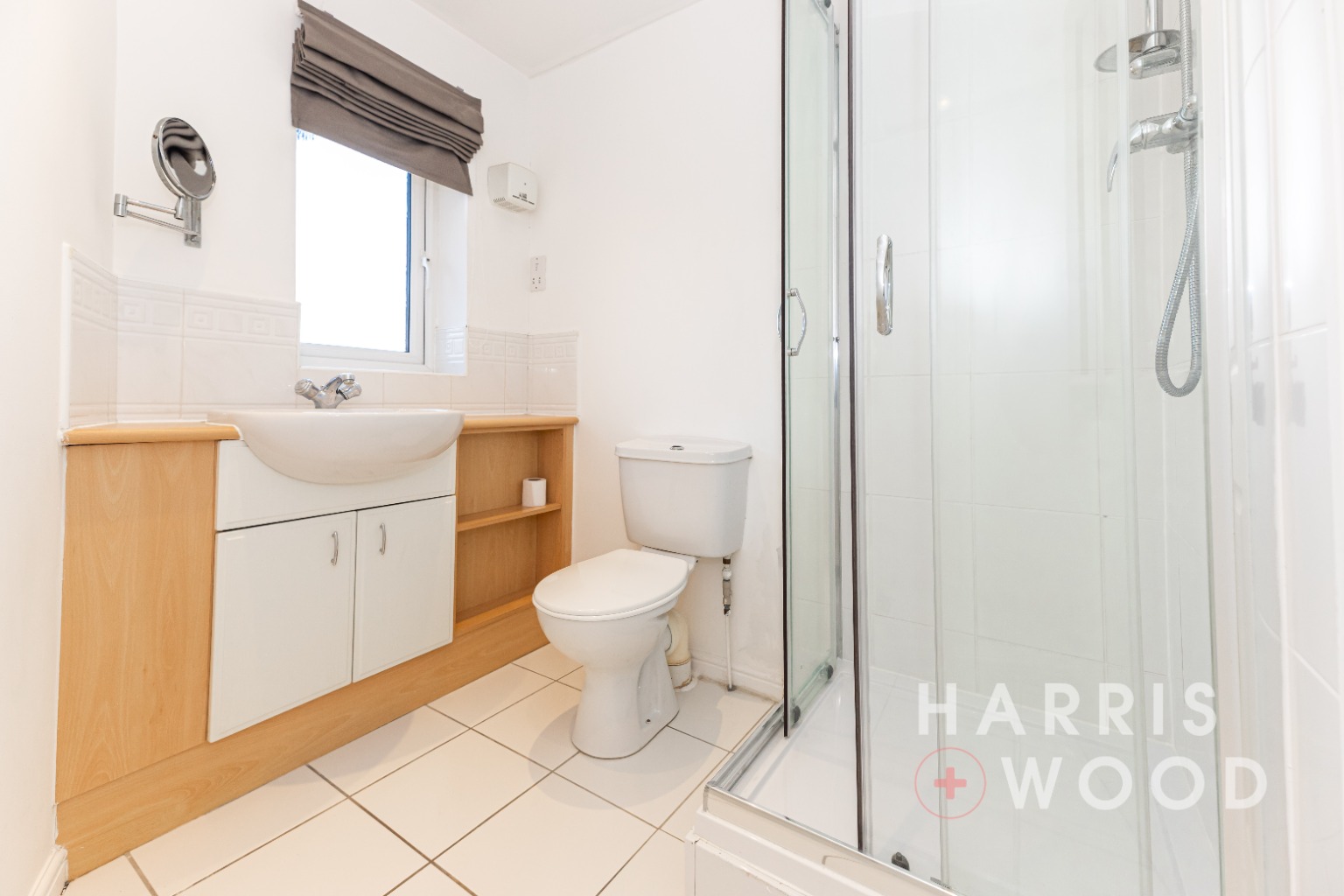 Obscure double glazed window, low level WC, wash hand basin, shower cubicle, partly tiled walls, tiled flooring, radiator