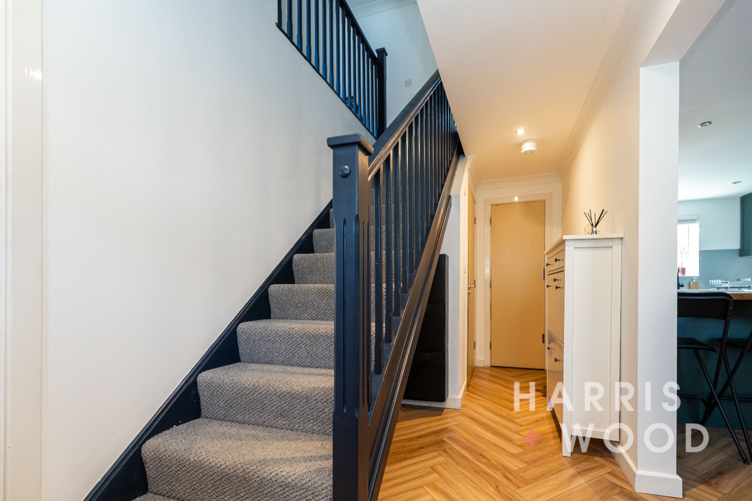 Entrance door, stairs rising to the first floor landing, understairs storage cupboard, radiator, spotlights, doors leading off