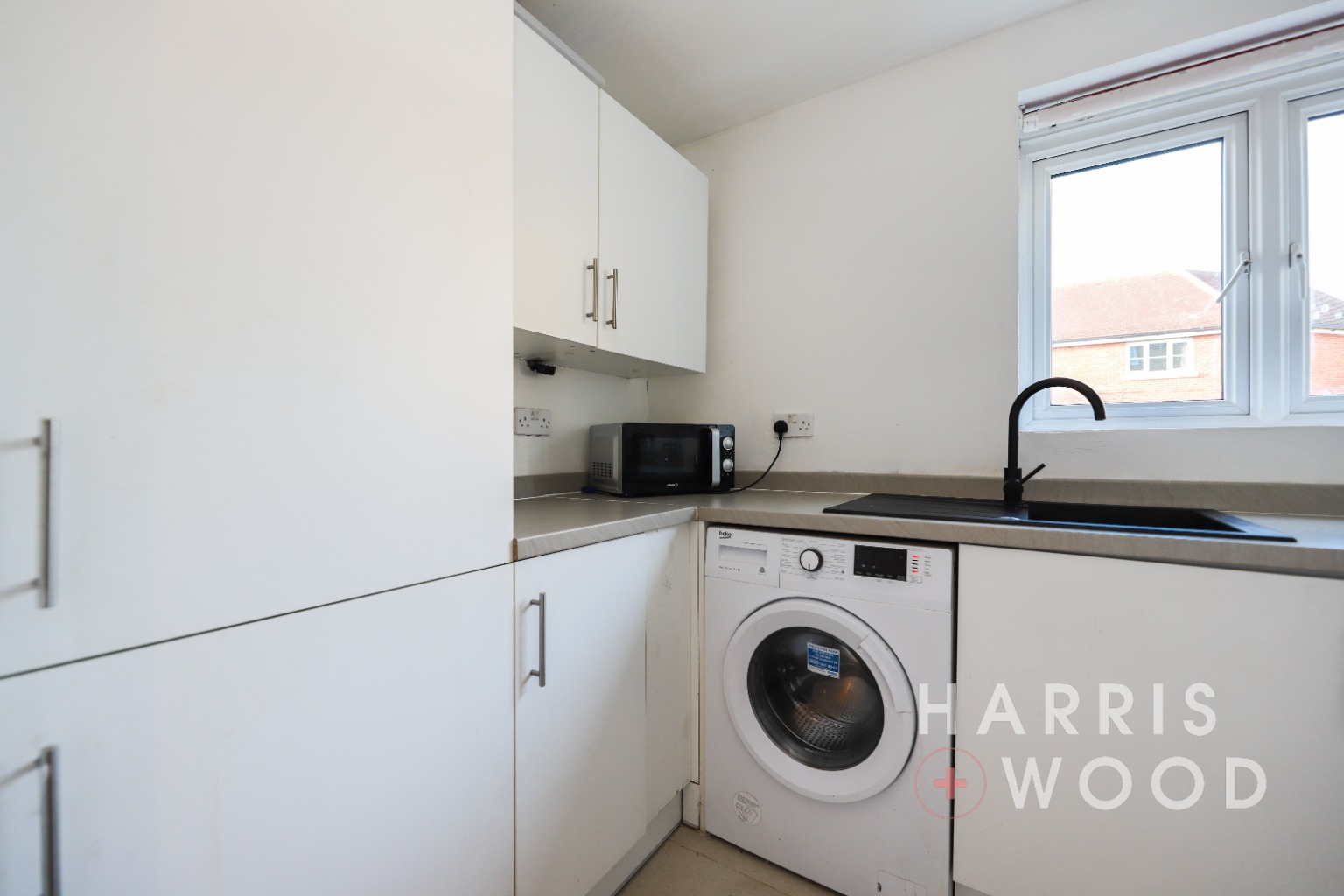 Wall and base level units, sink and drainer with mixer tap over, oven and hob, extractor fan, work surfaces, space for appliances