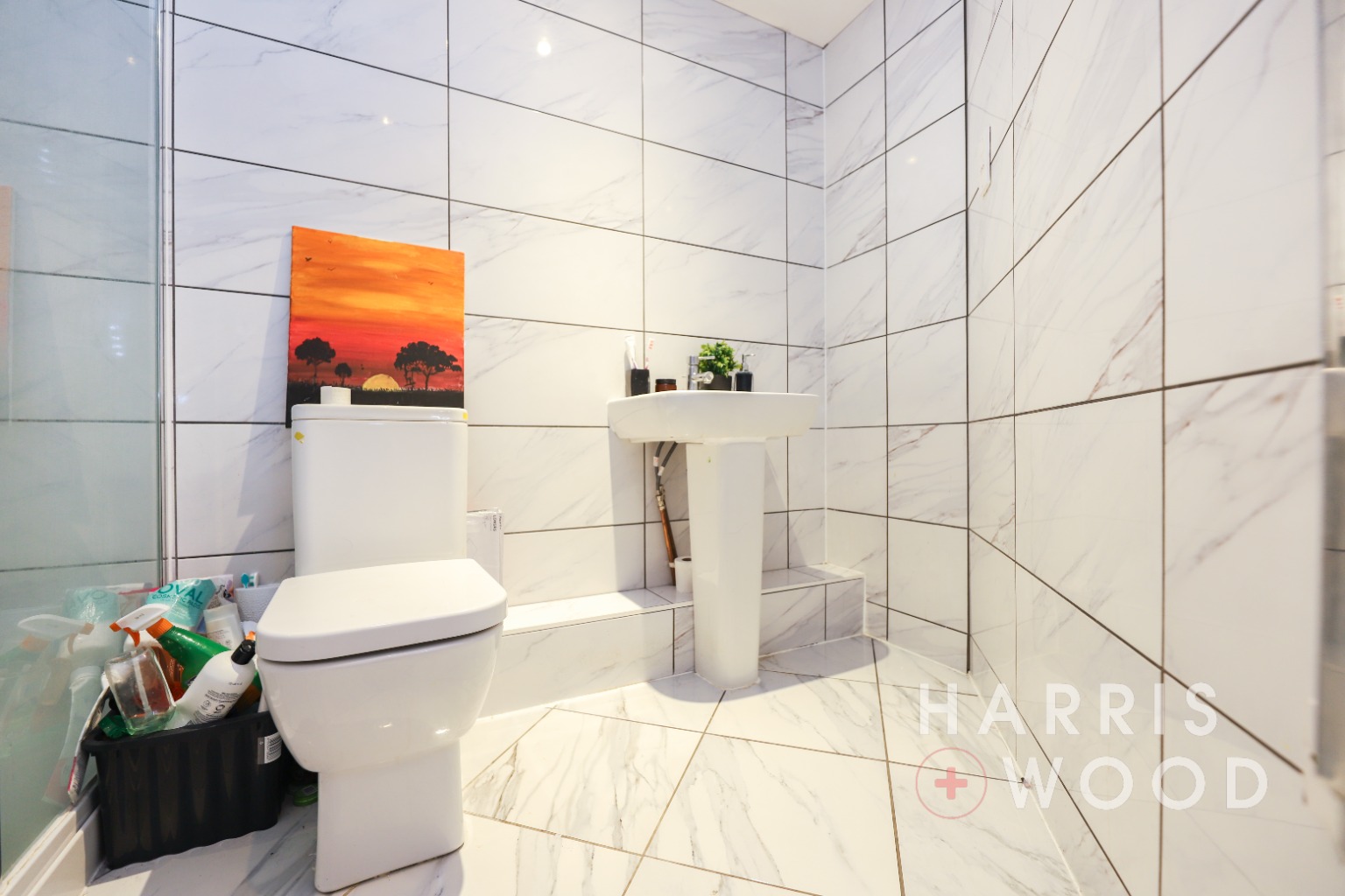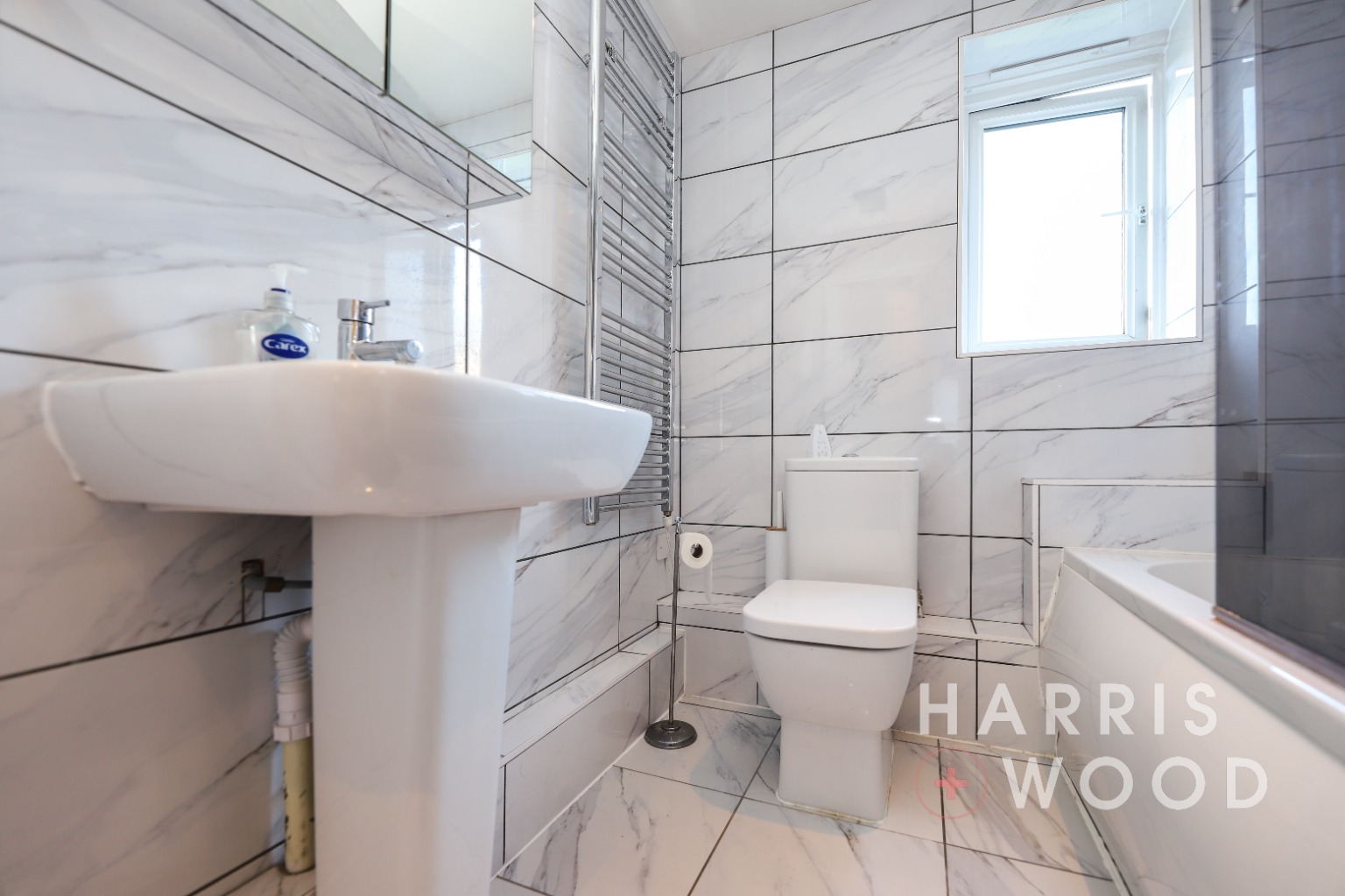 Low level WC, wash hand basin, panelled enclosed bath with shower over