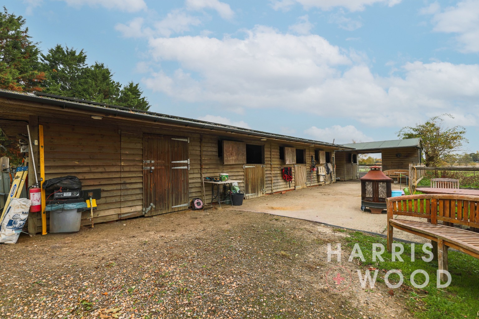 Externally, the property truly comes into its own, featuring a generous rear garden, a range of outbuildings, and stables, ideal for equestrian enthusiasts or those seeking additional storage or workshop space. A garage and private driveway provide ample off-road parking.