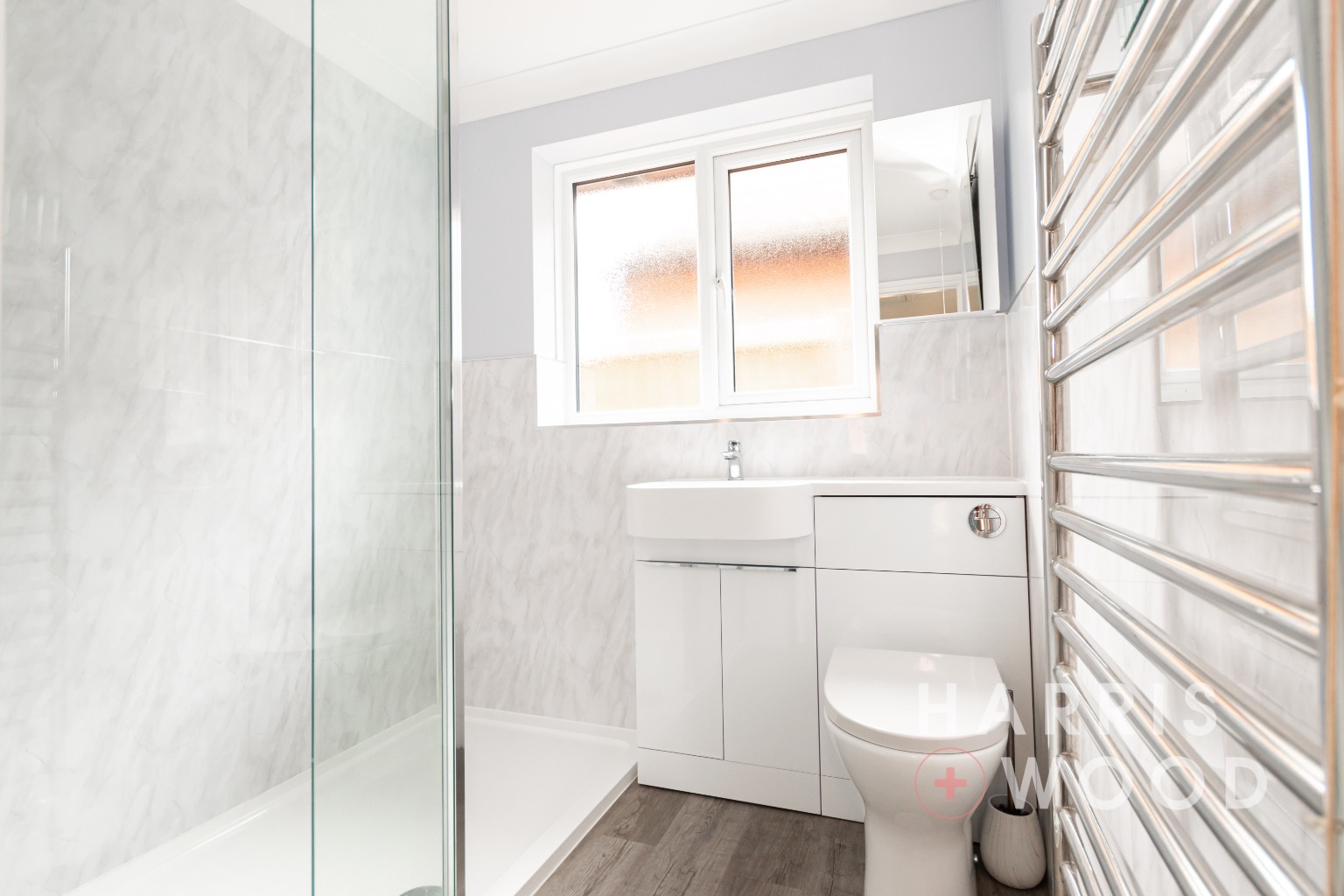 Double glazed window to side, low level WC, wash hand basin, double shower cubicle, heated towel rail