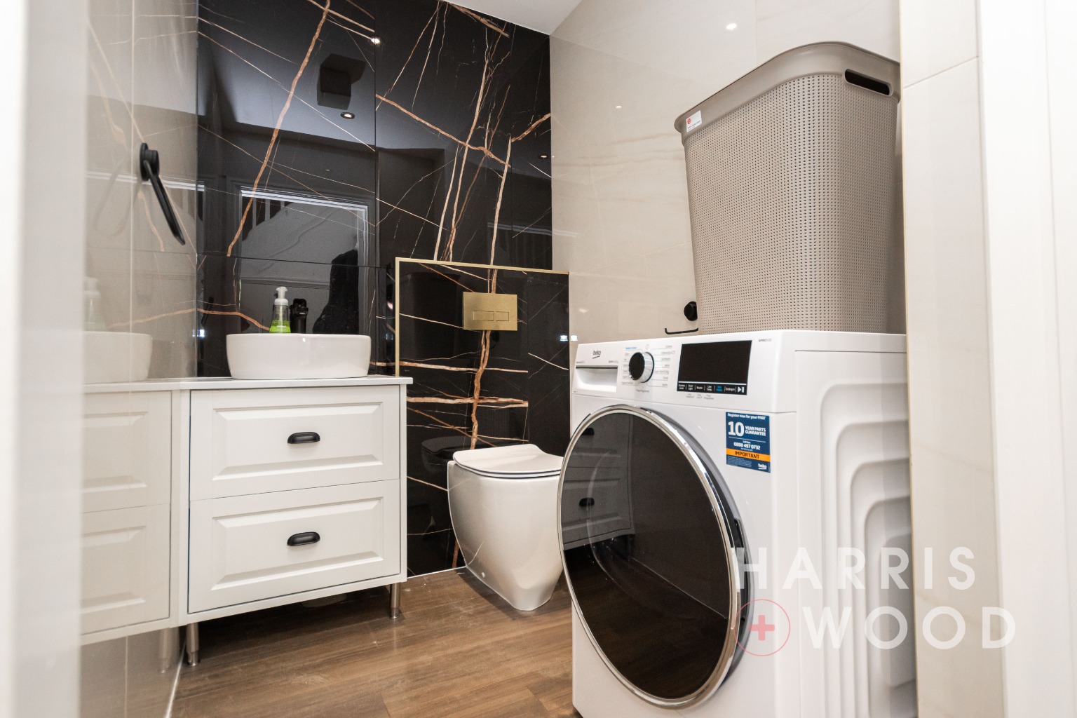 Double glazed window to rear, low level WC, wash hand basin, bath with shower over, heated towel rail