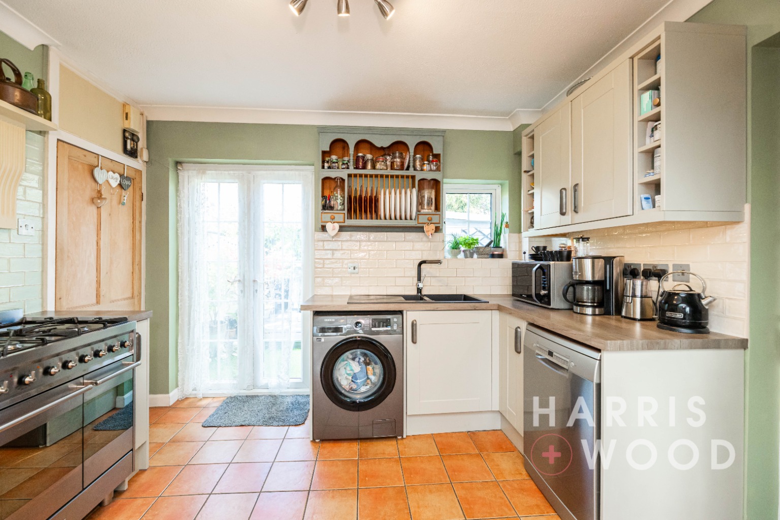 Double glazed windows and French doors, wall and base level units, sink and drainer with mixer tap over, oven and hob, extractor fan, worktops, space for appliances, radiator