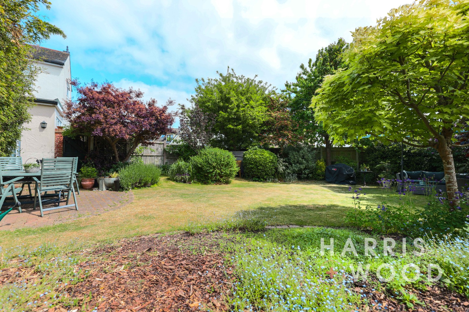 Fully enclosed and private, mainly laid to lawn, flower beds, shrubs and trees
