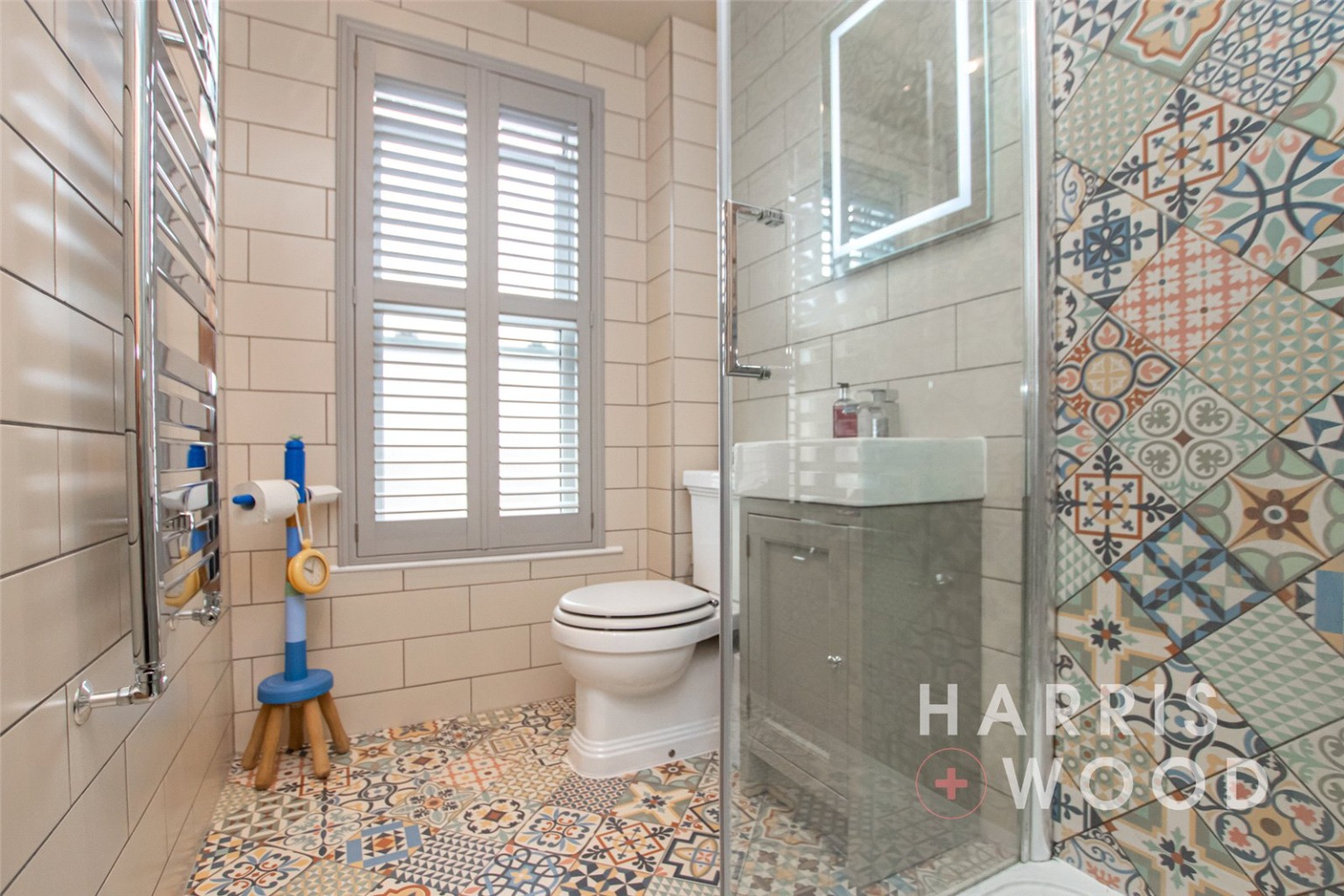 Double glazed sash windows to front with shutters, low level WC, wash hand basin, shower cubicle, heated towel rail
