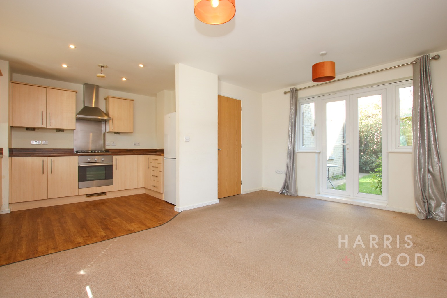 Double glazed windows and French doors, wall and base level units, sink and drainer with mixer tap over, oven and hob, extractor fan, worktops, space for appliances, radiator