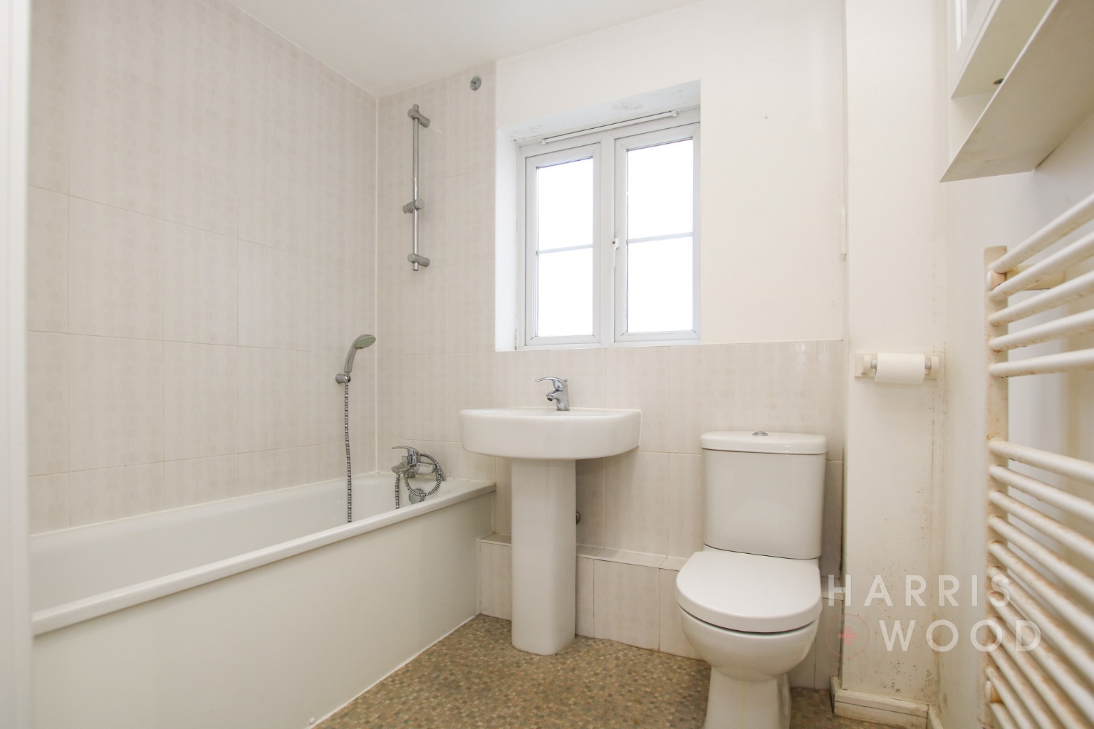 Double glazed window, low level WC, wash hand basin, bath with shower over, radiator