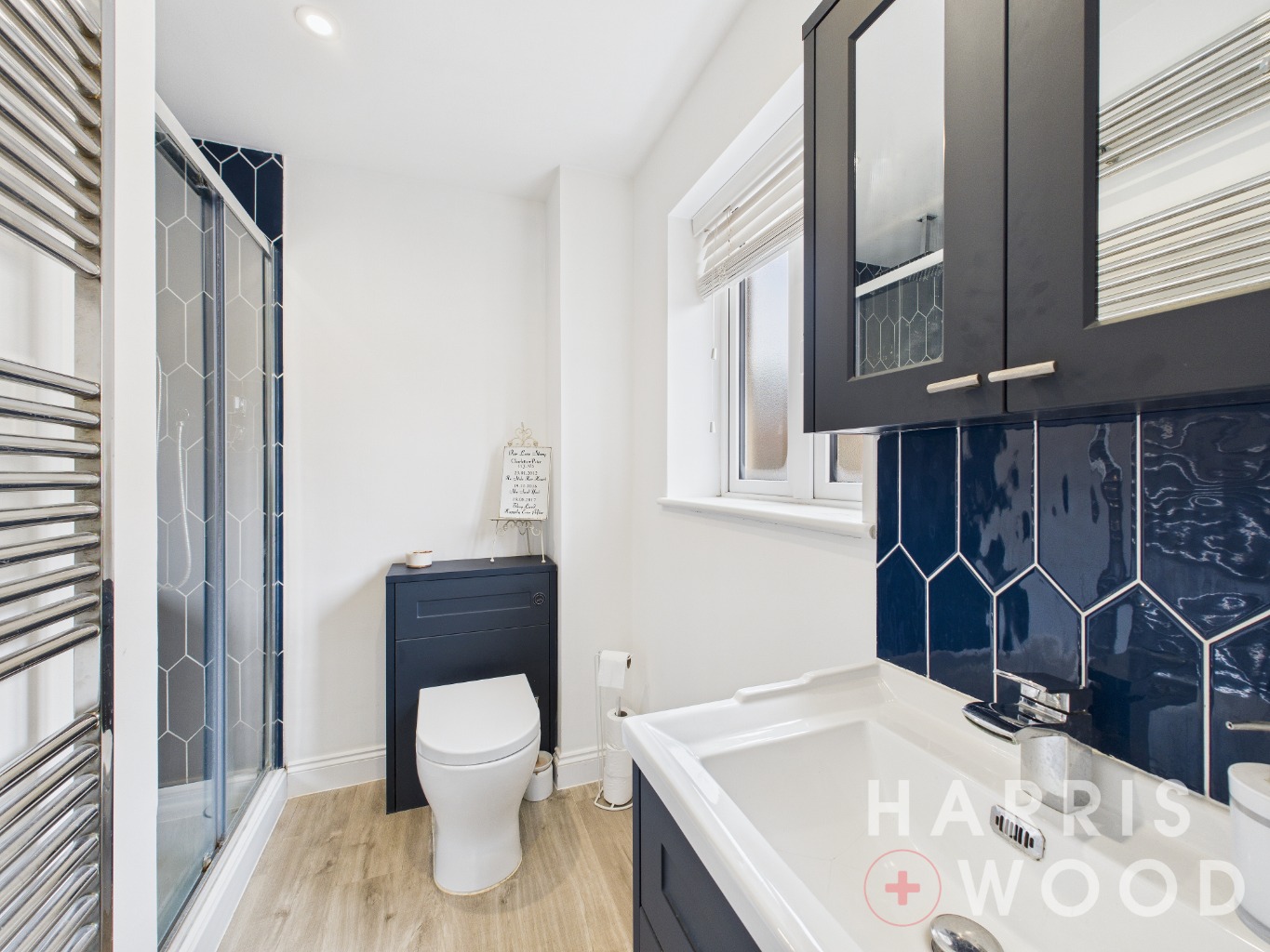 Low level WC, wash hand basin, shower cubicle, radiator