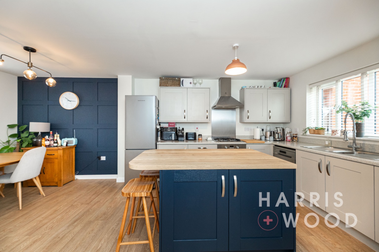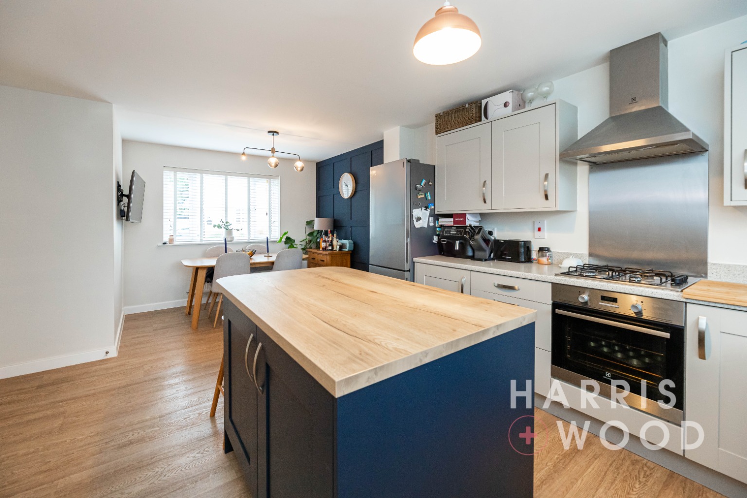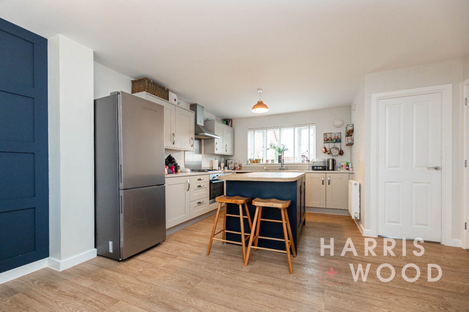 Step inside to a welcoming hallway leading to a bright sitting room with a feature fireplace and French doors opening onto the garden. The spacious kitchen/dining room features dual aspect windows, a central island with breakfast bar, integrated oven and hob, and ample storage. A separate utility room and ground floor cloakroom add to the practicality.