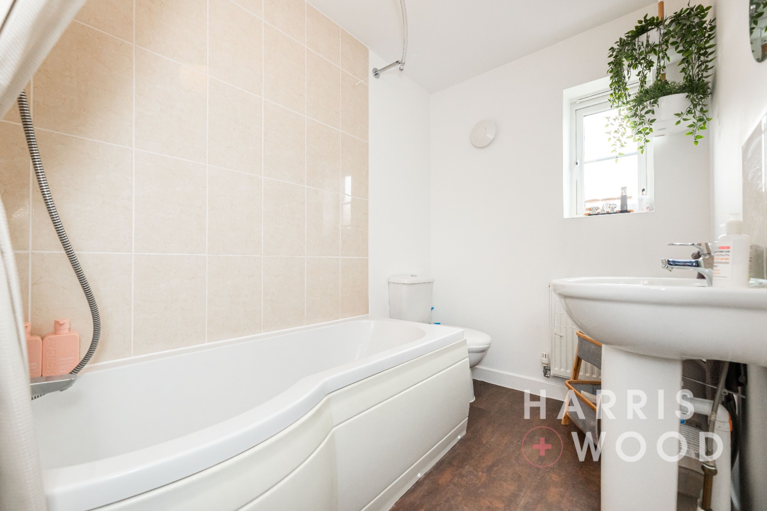 Double glazed window to side, low level WC, pedestal wash hand basin, bath with shower over, radiator