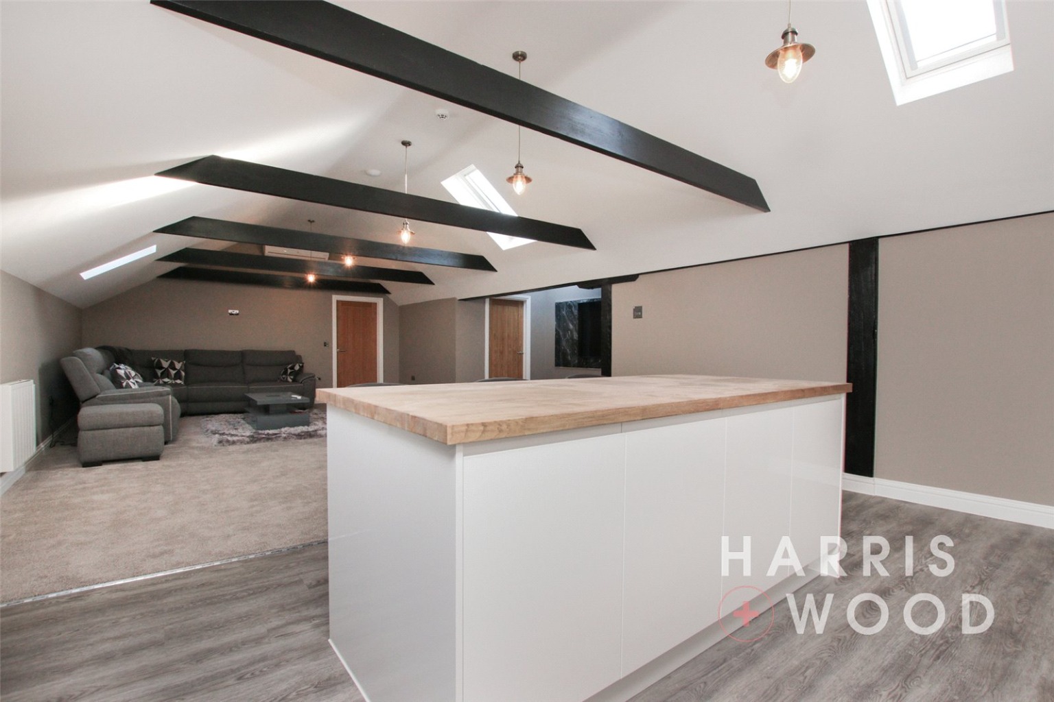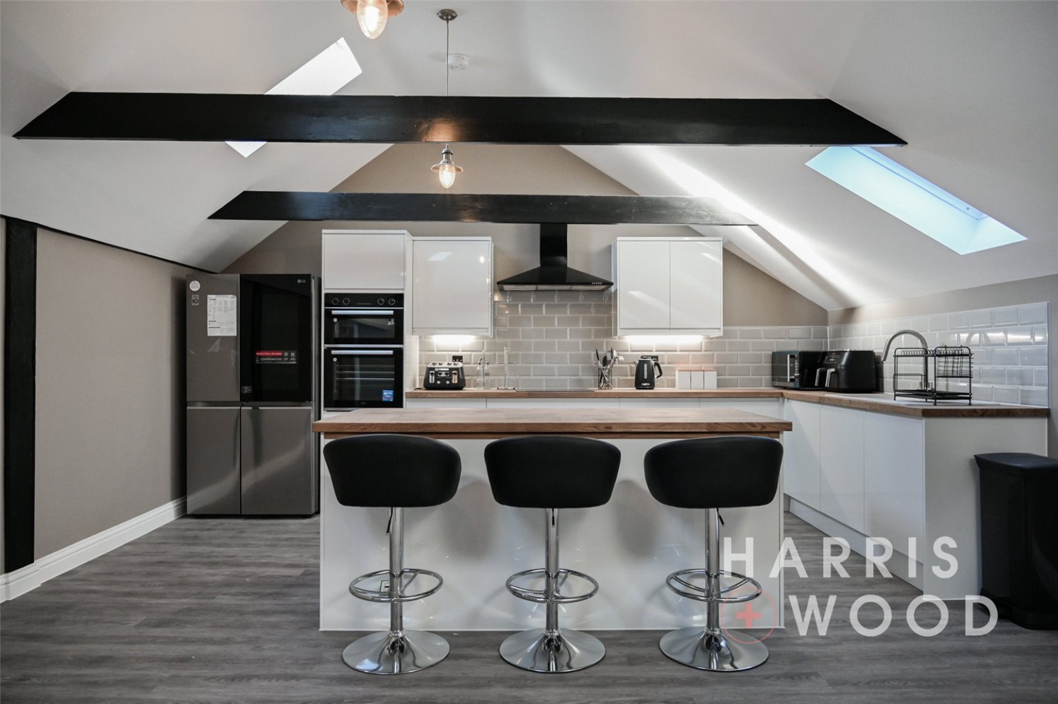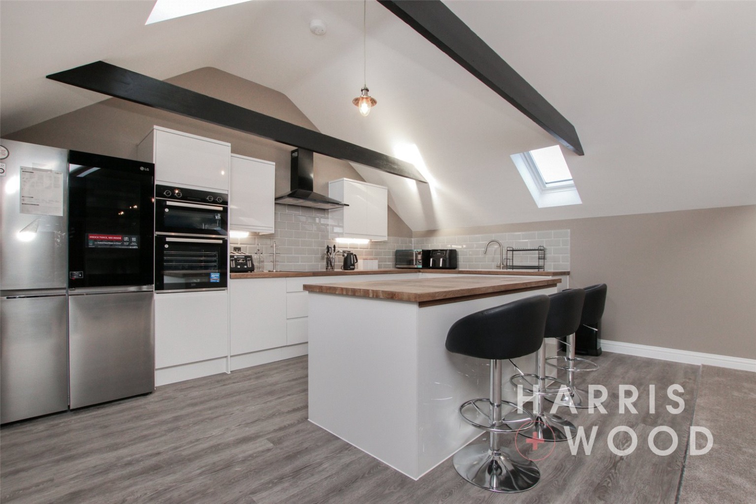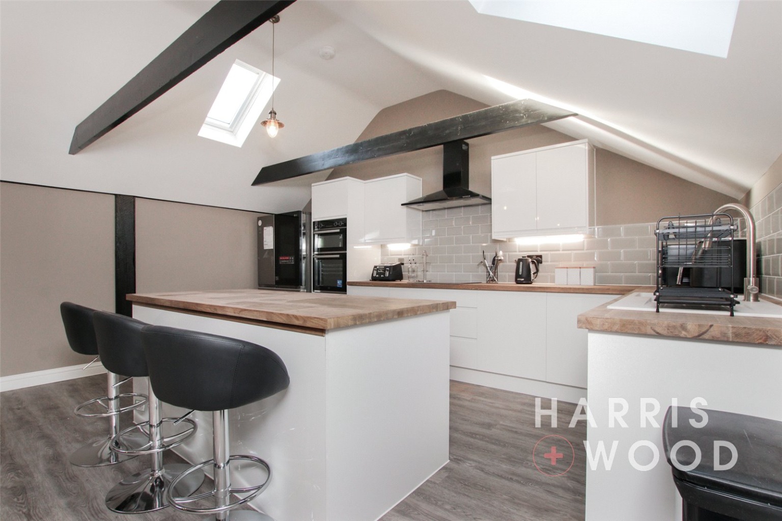 Three Velux windows, air con unit, electric heater, beams, wall and base level units, tiled splashbacks, island, vinyl flooring, integrated double oven, hob, extractor fan, space for appliances, sink and drainer with mixer tap over, spotlgihts to ceiling