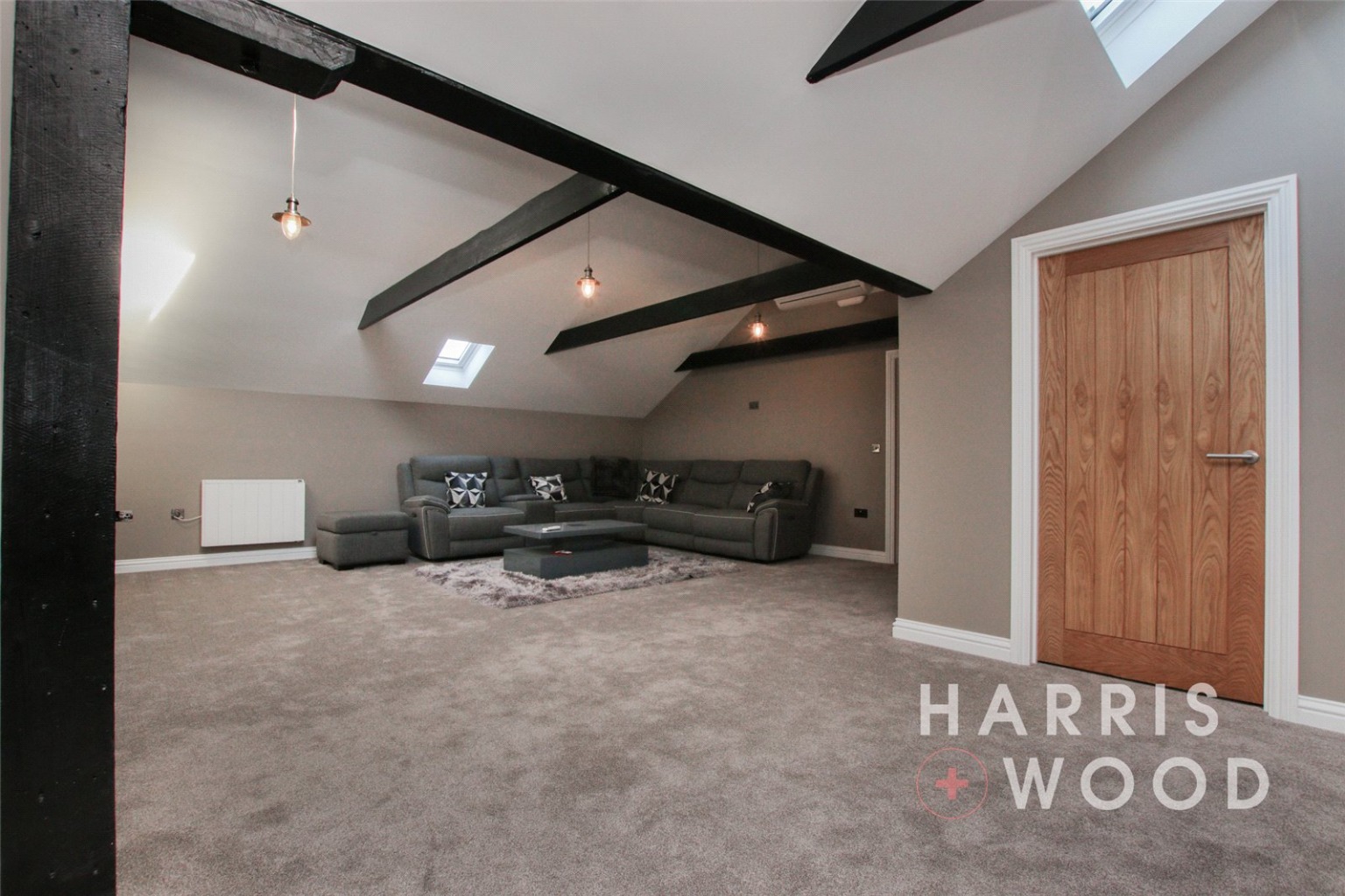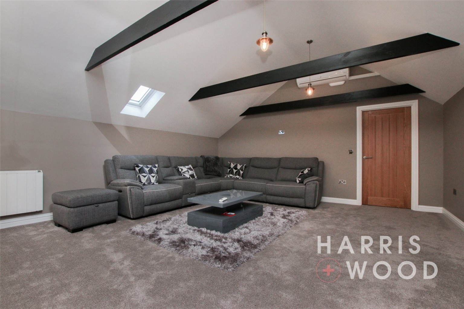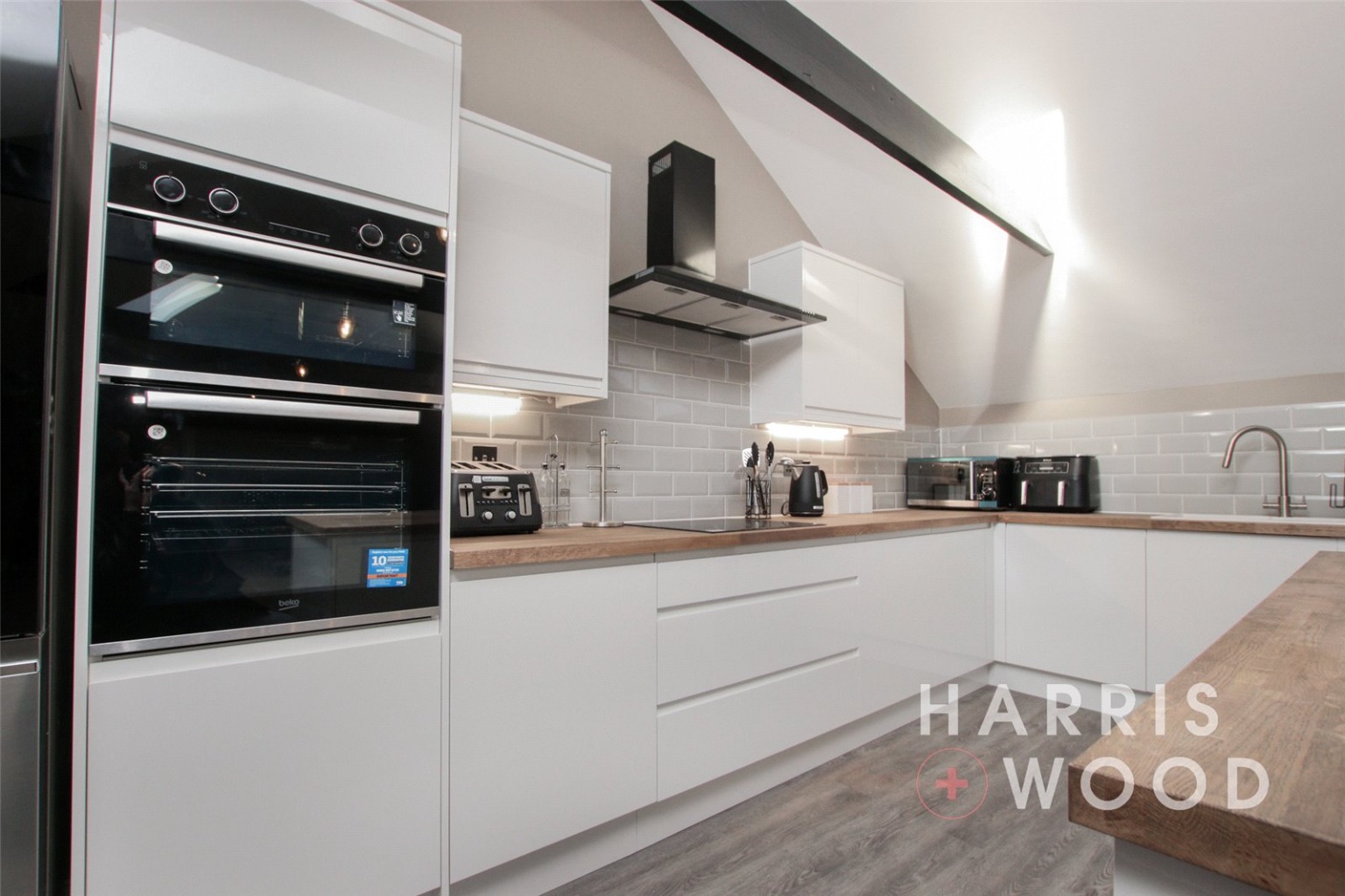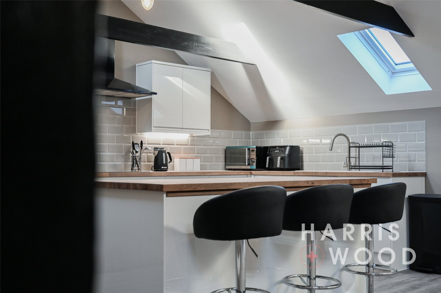 Three Velux windows, air con unit, electric heater, beams, wall and base level units, tiled splashbacks, island, vinyl flooring, integrated double oven, hob, extractor fan, space for appliances, sink and drainer with mixer tap over, spotlgihts to ceiling