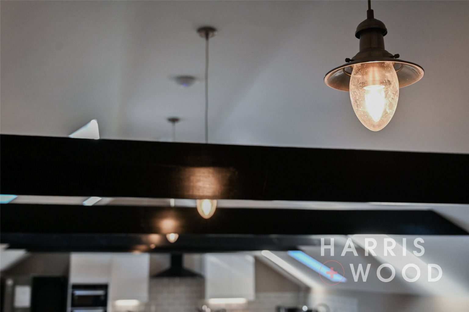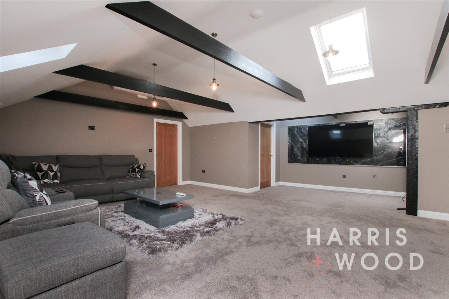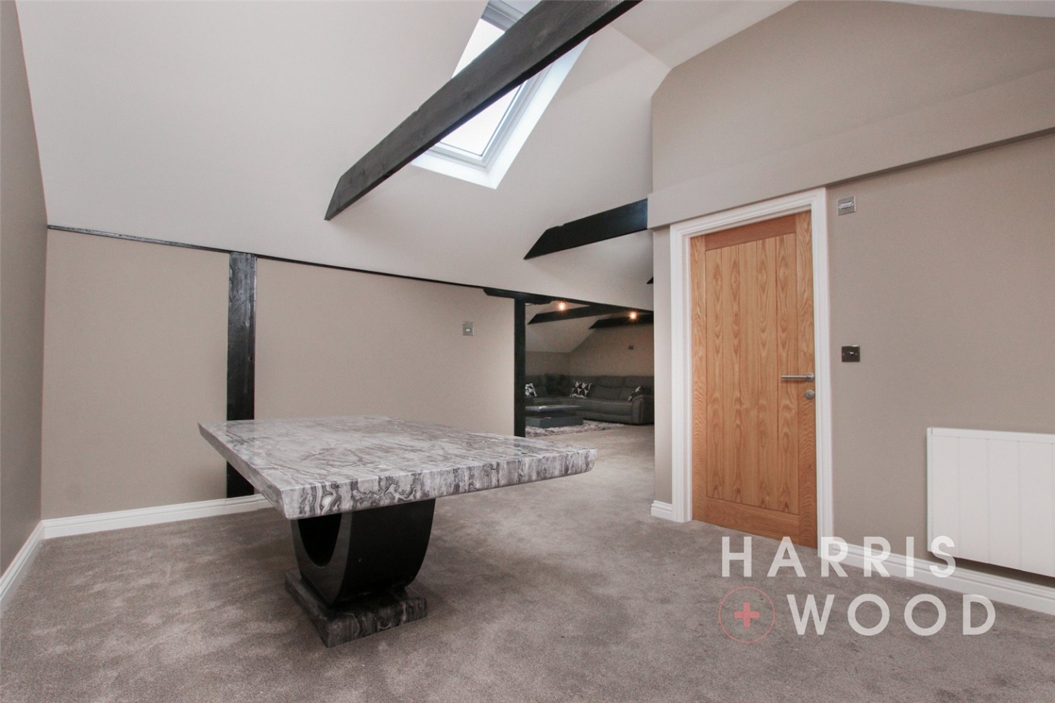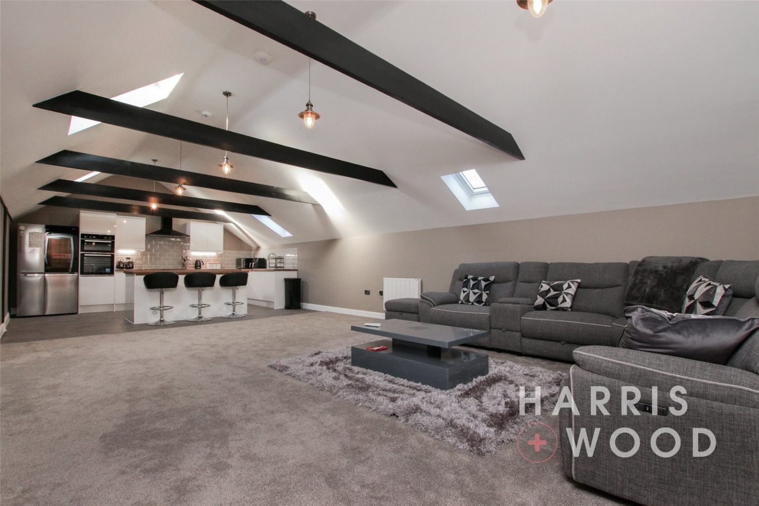 Three Velux windows, air con unit, electric heater, beams, wall and base level units, tiled splashbacks, island, vinyl flooring, integrated double oven, hob, extractor fan, space for appliances, sink and drainer with mixer tap over, spotlgihts to ceiling