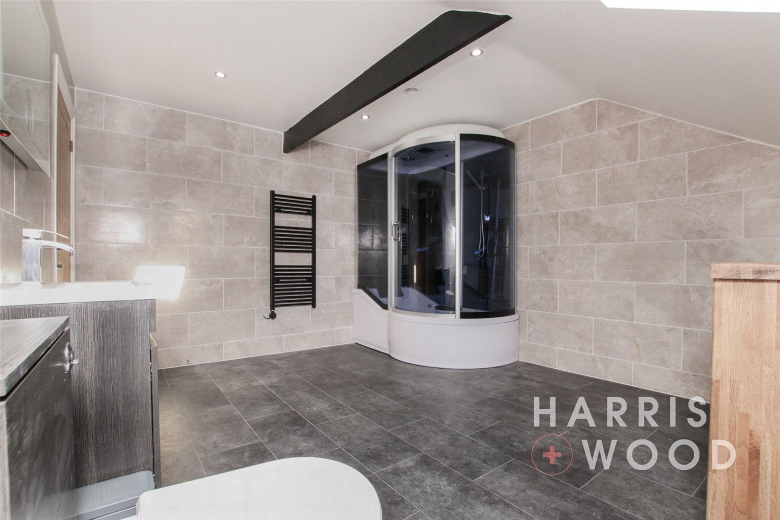 Velux window, tiled walls, vinyl flooring, low level WC, pedestal wash hand basin, base units with oak worktop, panelled enclosed bath with shower and screen, bluetooth settings and jacuzzi jets, spotlights to ceiling, beams