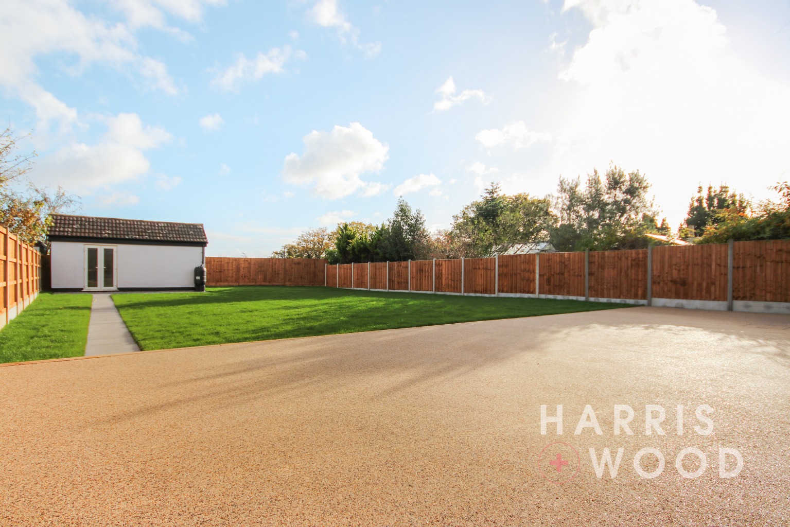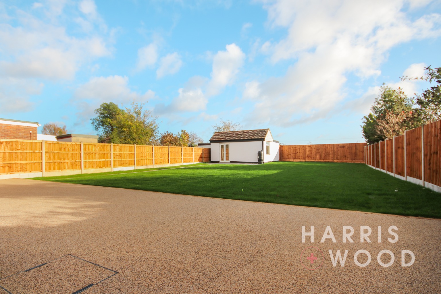 Fully enclosed and private, large patio and resin areas, laid to lawn (Outbuilding 19'3" x 18'5")