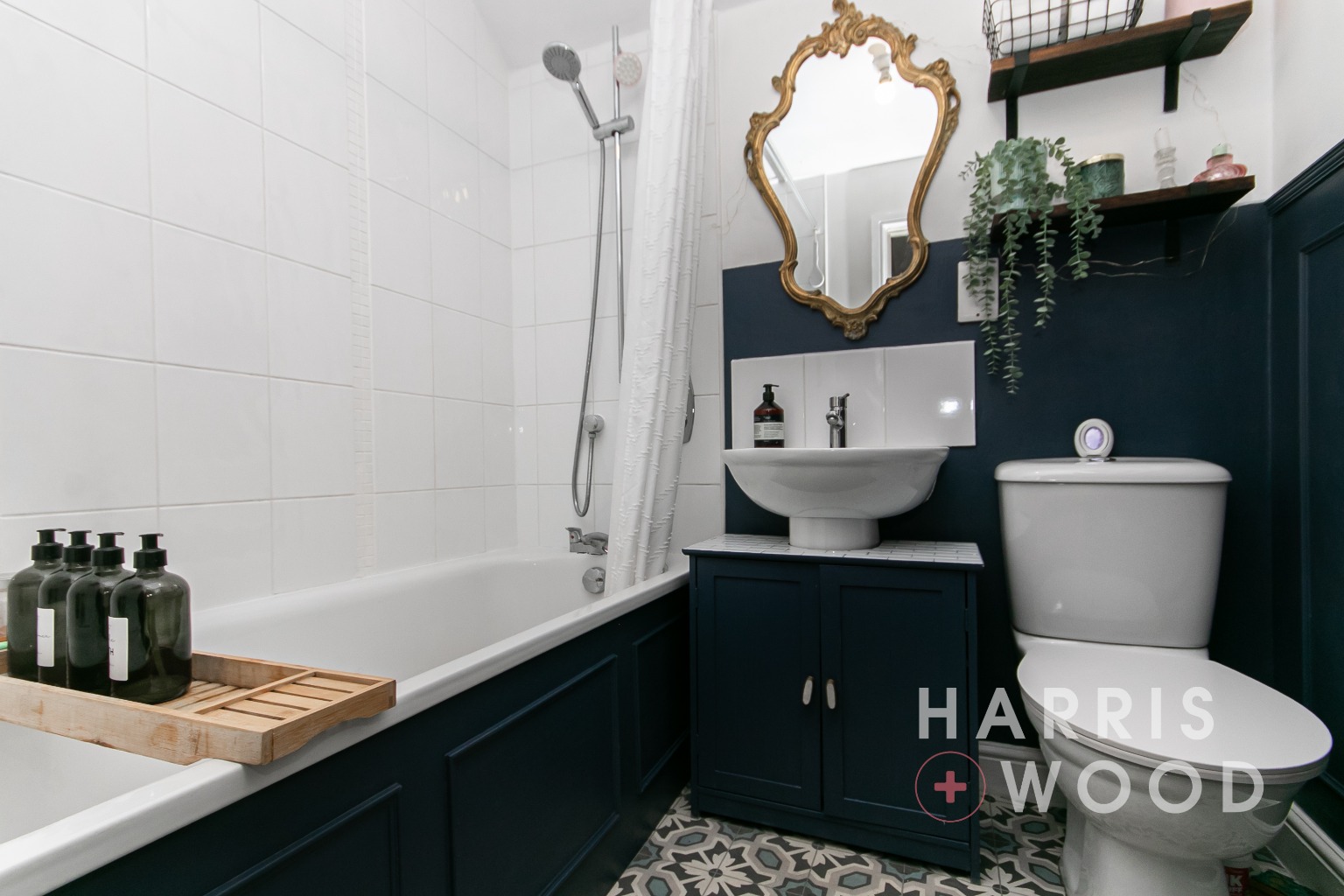 Low level WC, pedestal hand wash basin, panelled bath with shower over, part tiled walls