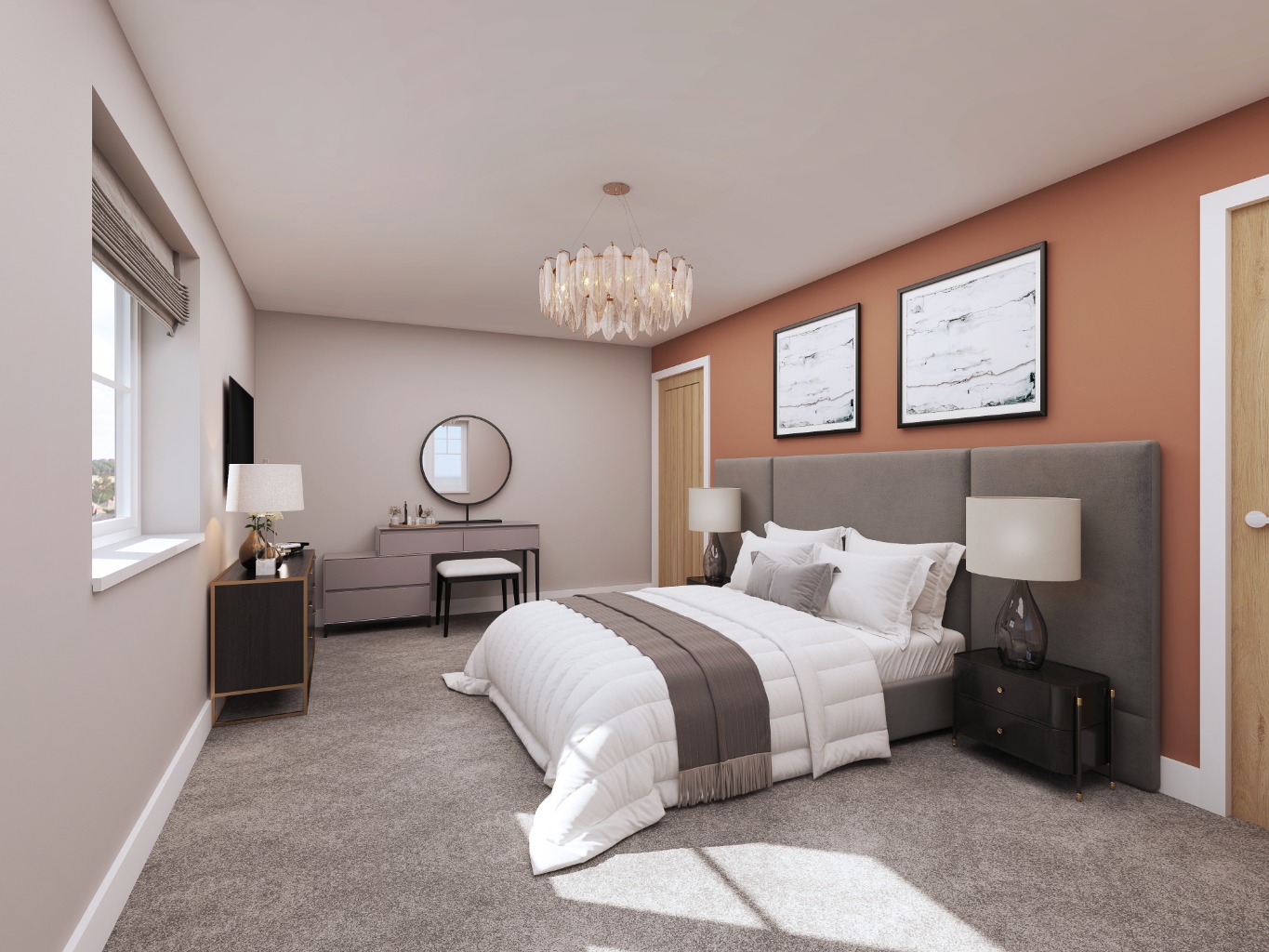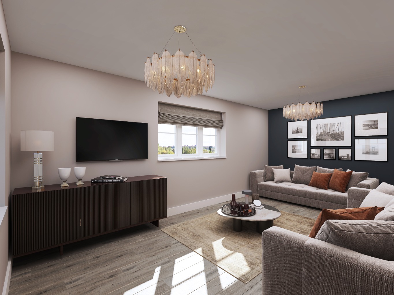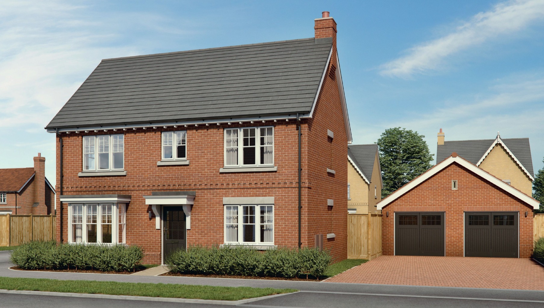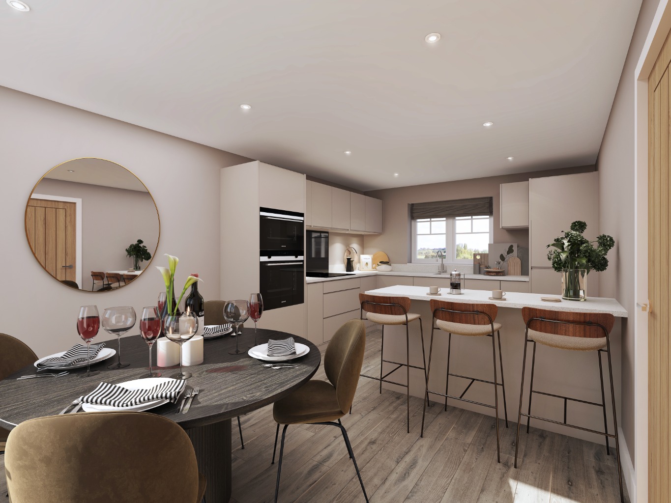 broad windows, and a convenient dining room with a feature bay window offering views across the development’s curved avenues.